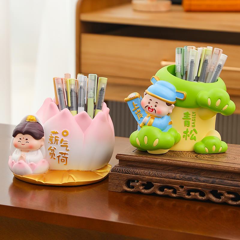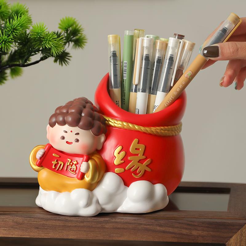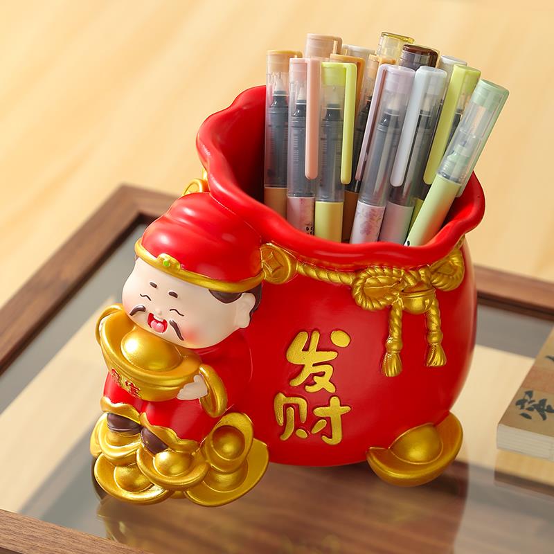 创意财神爷笔筒办公室桌面收纳盒工位招财装饰学生房间改造小物件