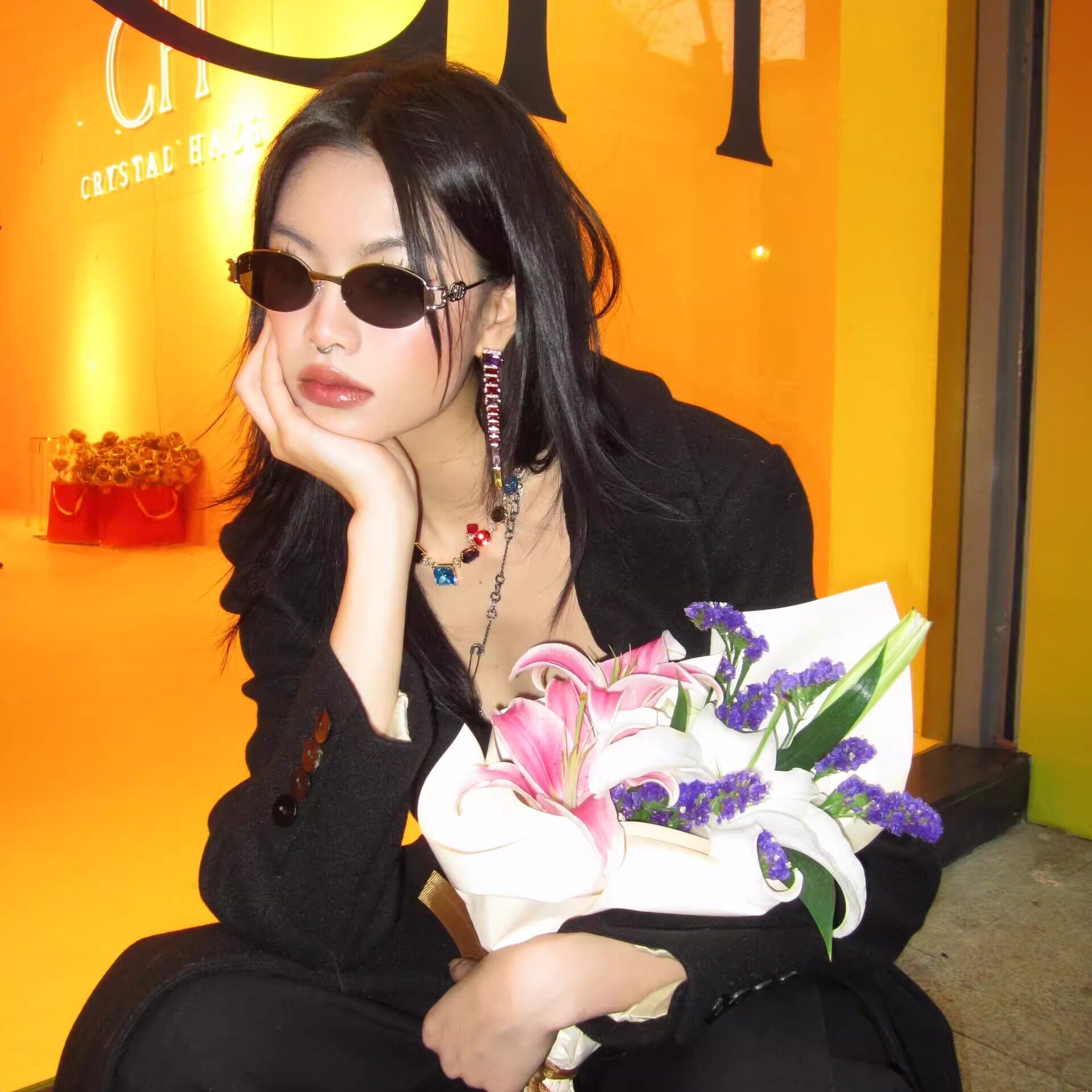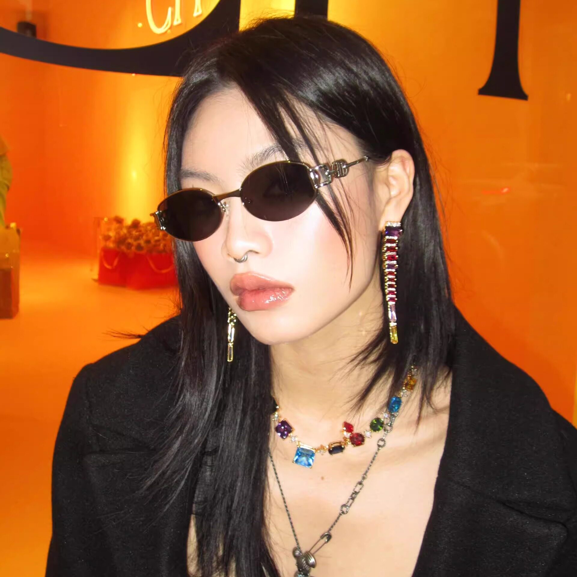 404的店韩版椭圆金属墨镜Y2K时髦优雅街拍太阳眼镜防紫外线男女酷