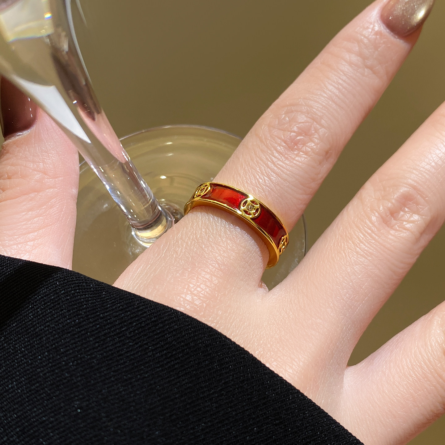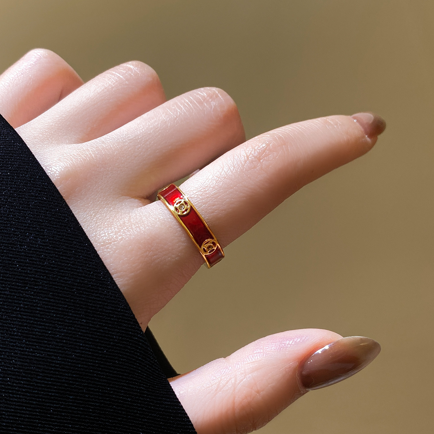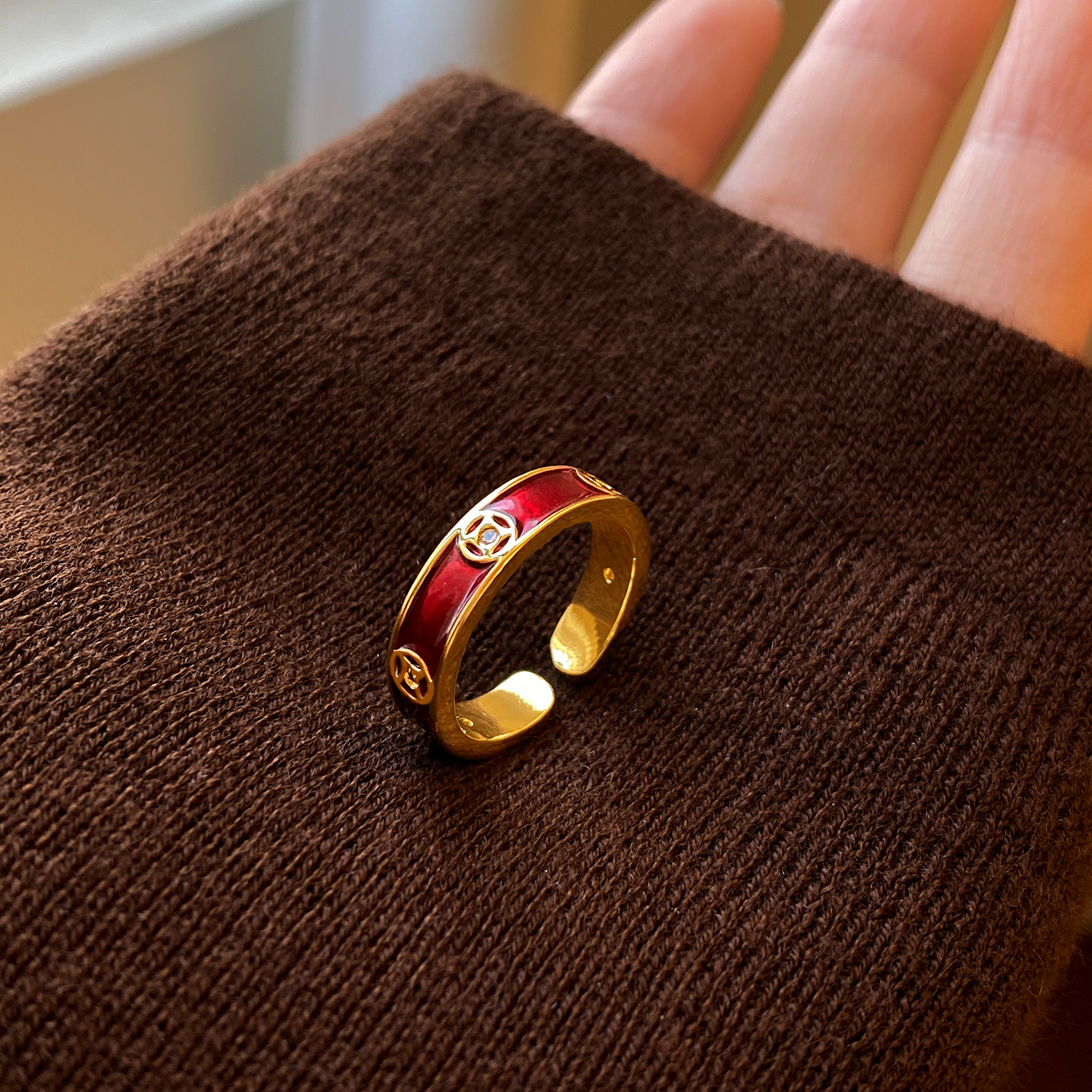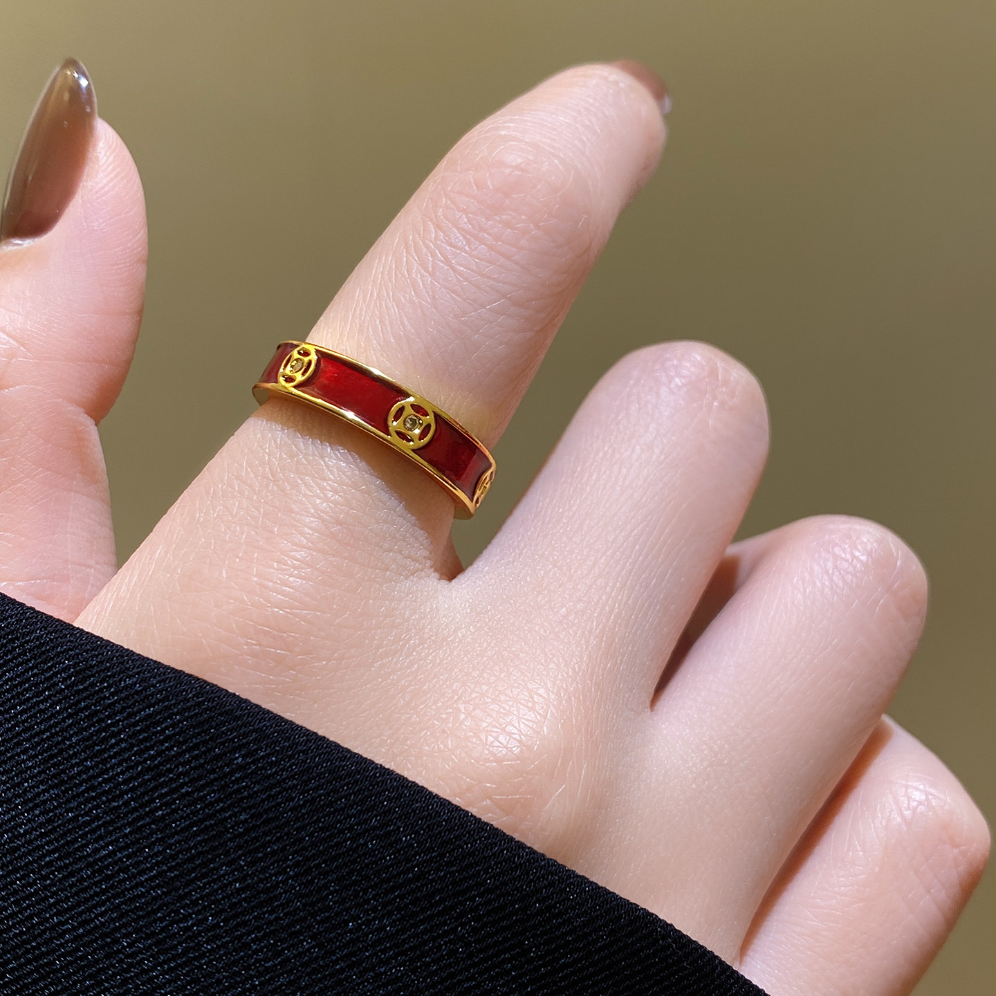红色晕染金色钱币开口戒指女轻奢高级感闺蜜食指指环2026新款爆款