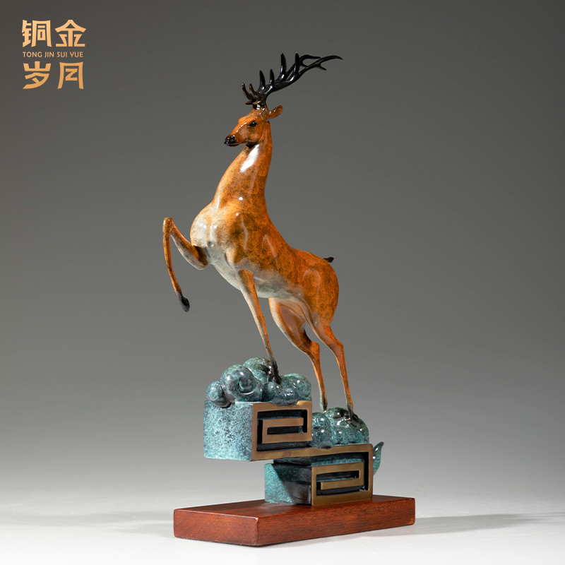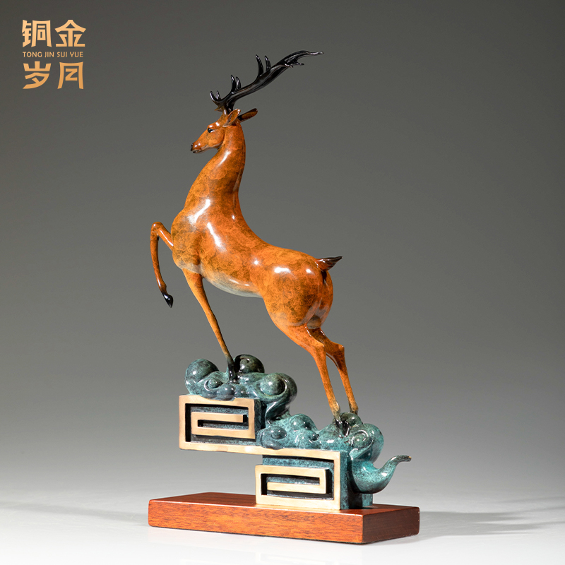 《飞云祥鹿》铜金岁月黄铜摆件新中式工艺品家居客厅玄关桌面装饰