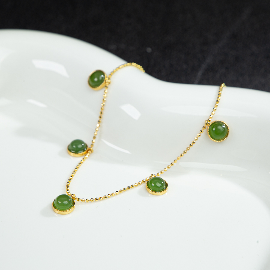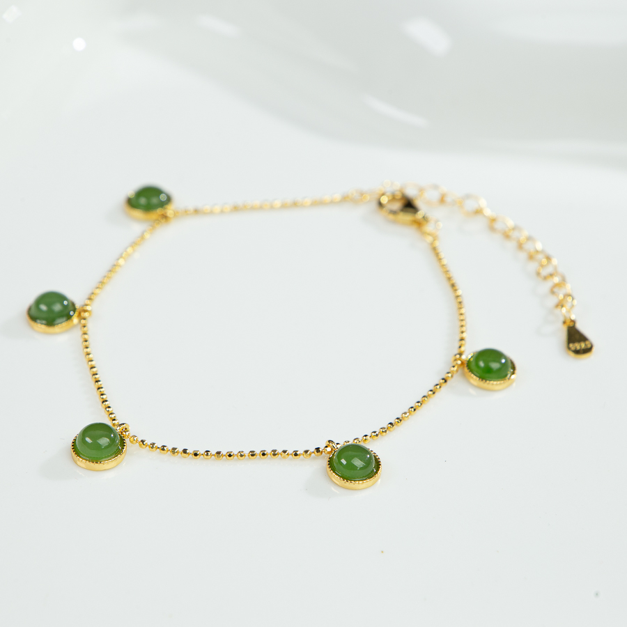 天然老料和田玉碧玉五珠蛋面S925银镶玉石女款手链高档送礼带证书