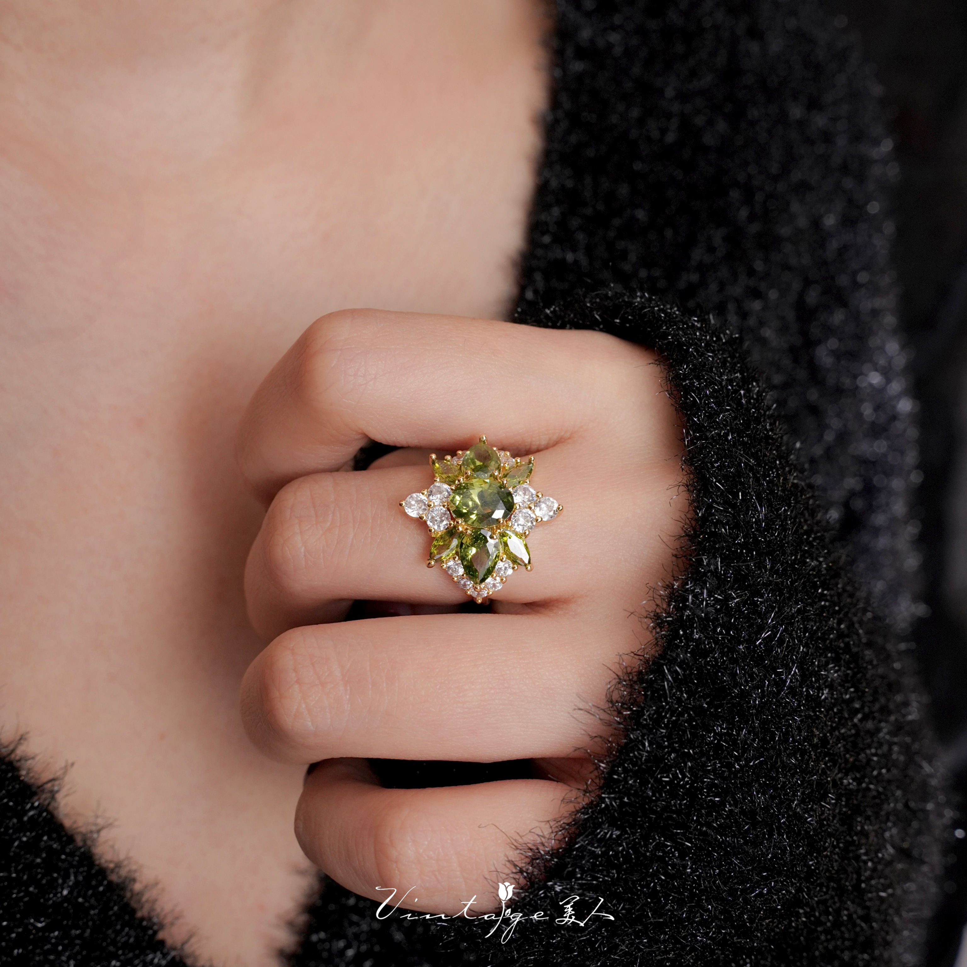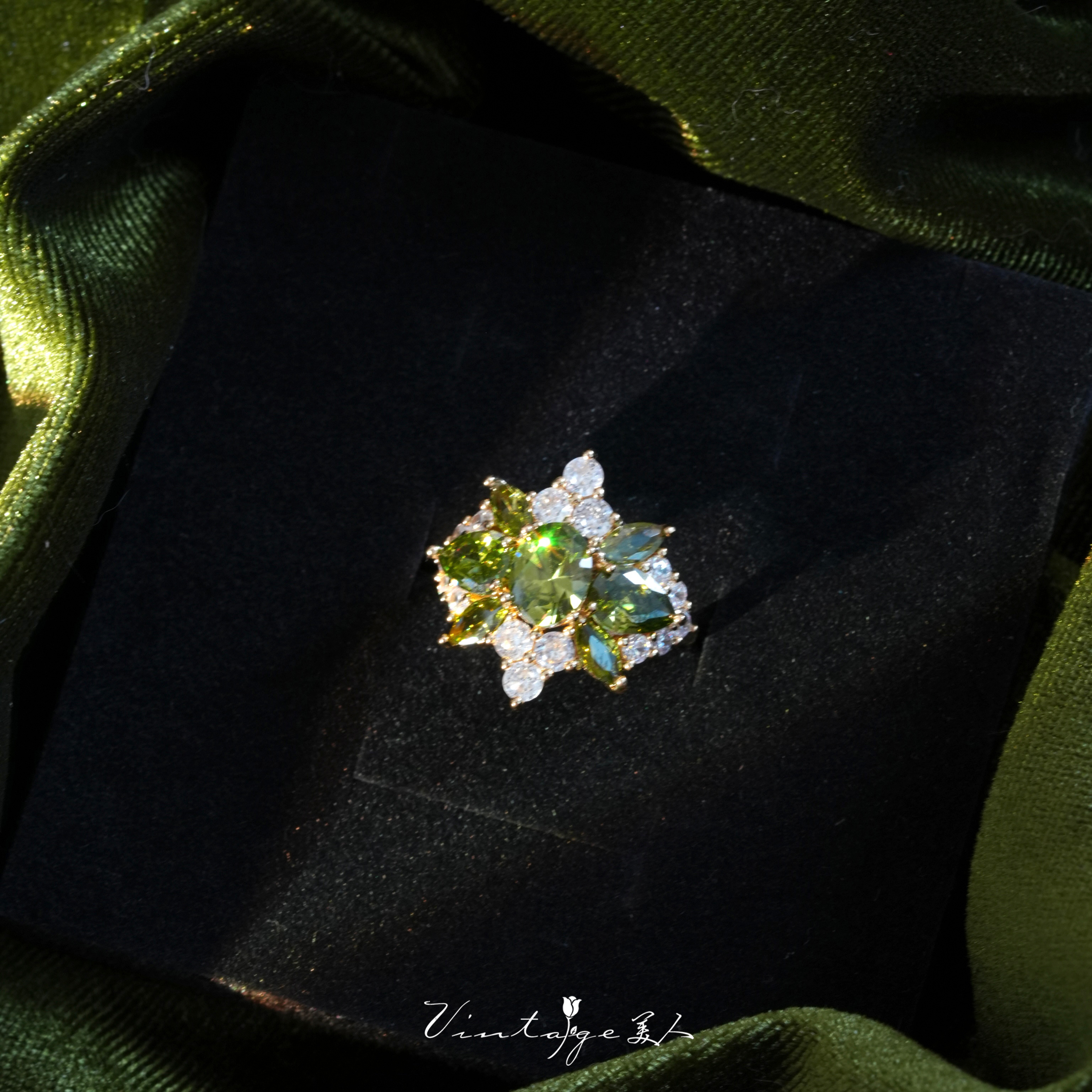 「橄榄枝」vintage复古轻奢高级感贵气闪耀橄榄绿宝石开口戒指女
