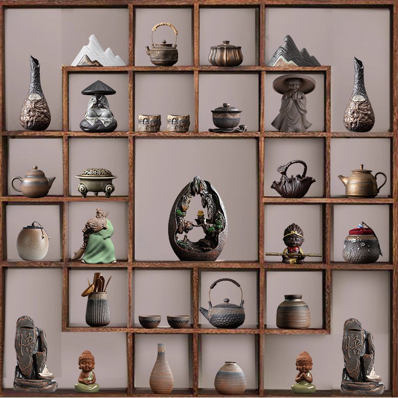 茶室博古架茶柜装饰茶壶茶罐茶杯茶宠中式禅意复古怀旧茶具摆件