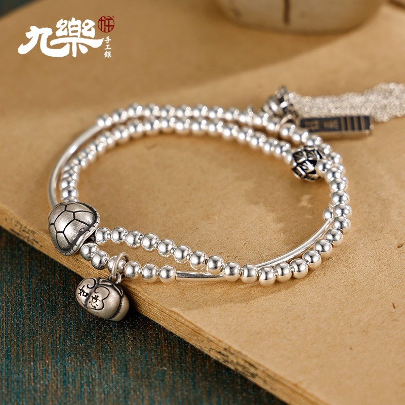 九乐990纯银圆珠手链女足银复古双层银珠珠手串流苏银手链送女友