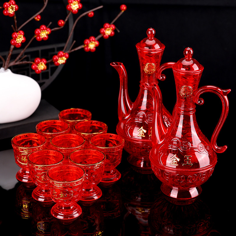 敬神拜拜茶酒杯红色水晶塑料高脚酒杯喜庆交杯酒酒壶茶壶碗筷全套