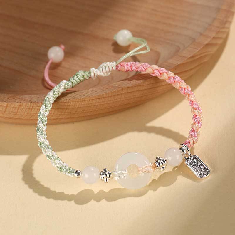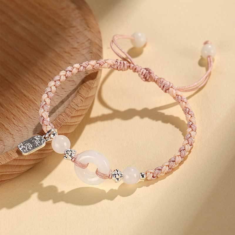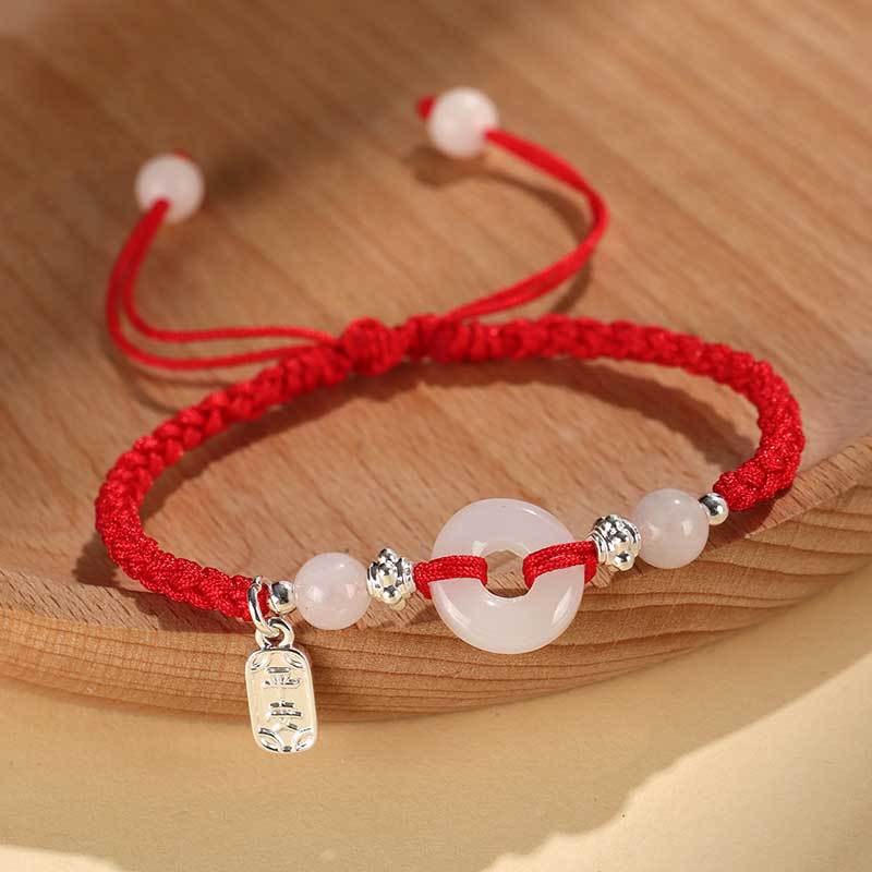 白玉髓红色手工编制手链女原创设计平安扣手绳平安喜乐吊牌红绳