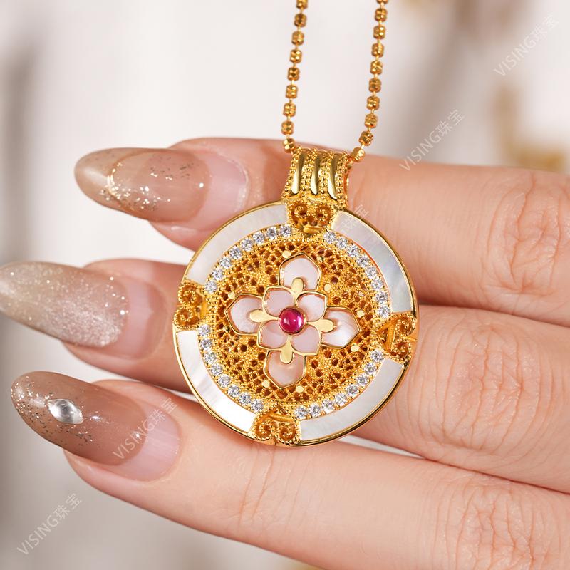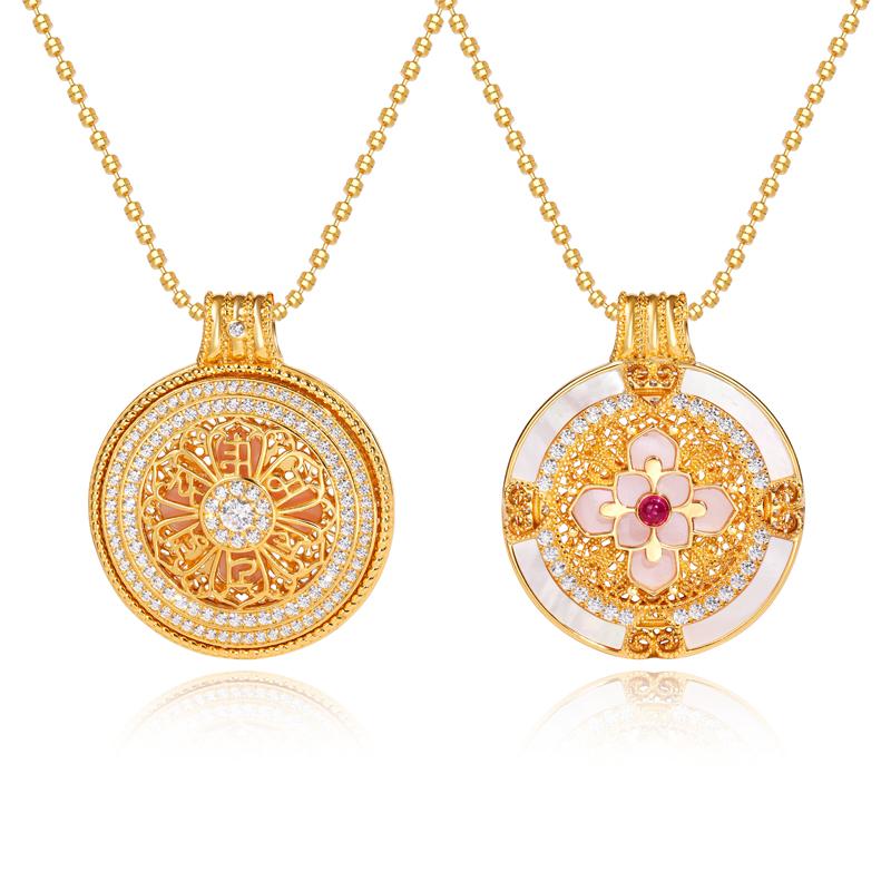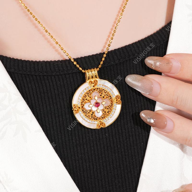 VISING金色四叶草贝母如意圆牌两戴金项链设计款国风毛衣链