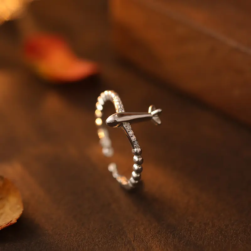 s925银欧美简约飞机戒指女个性时尚开口满钻小众指环指戒新