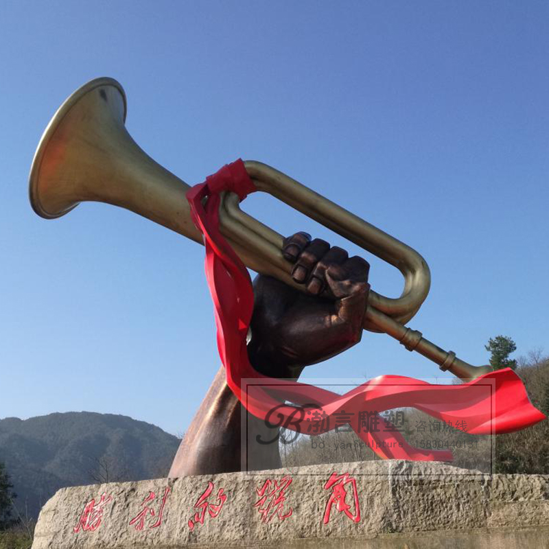 玻璃钢仿铜胜利号角雕塑红色文化主题冲锋号红旗景观模型公园摆件