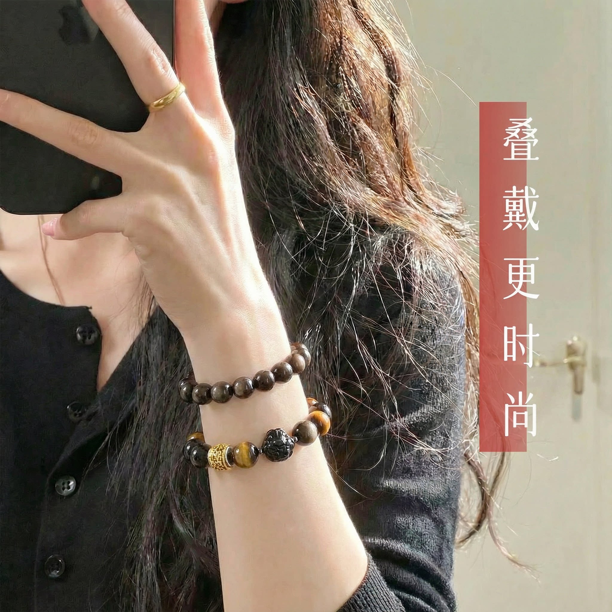手链女款2026新款手串天然虎眼石银耀石黑耀石藏银转运珠十二生肖