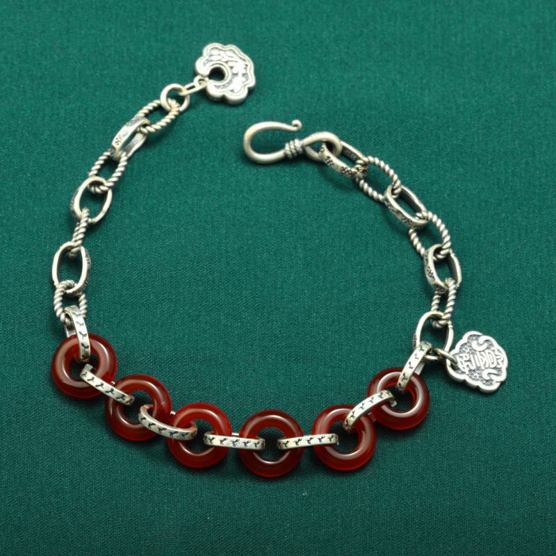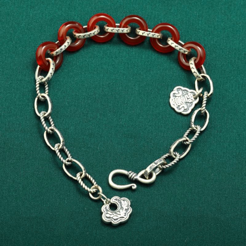 S925纯银玛瑙圆形平安扣手链 复古做旧如意锁树叶简约手串手环