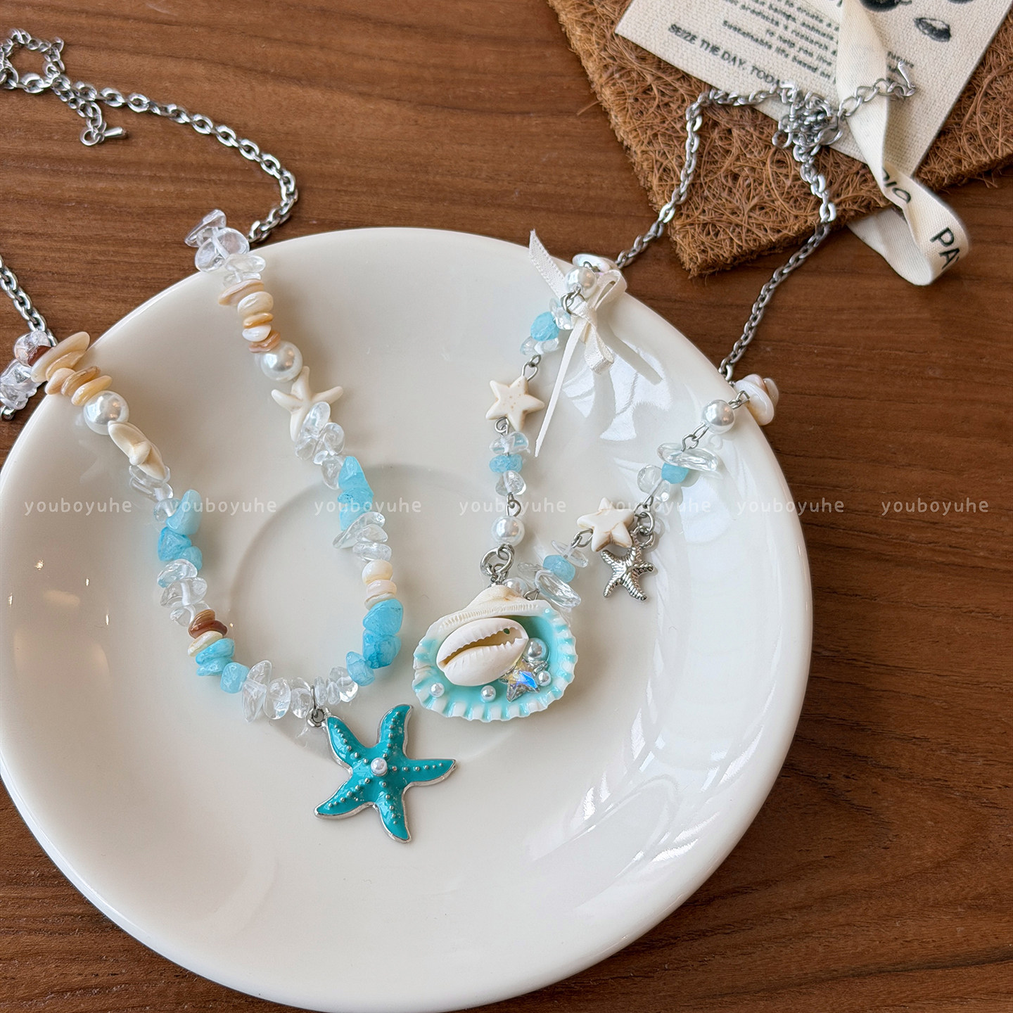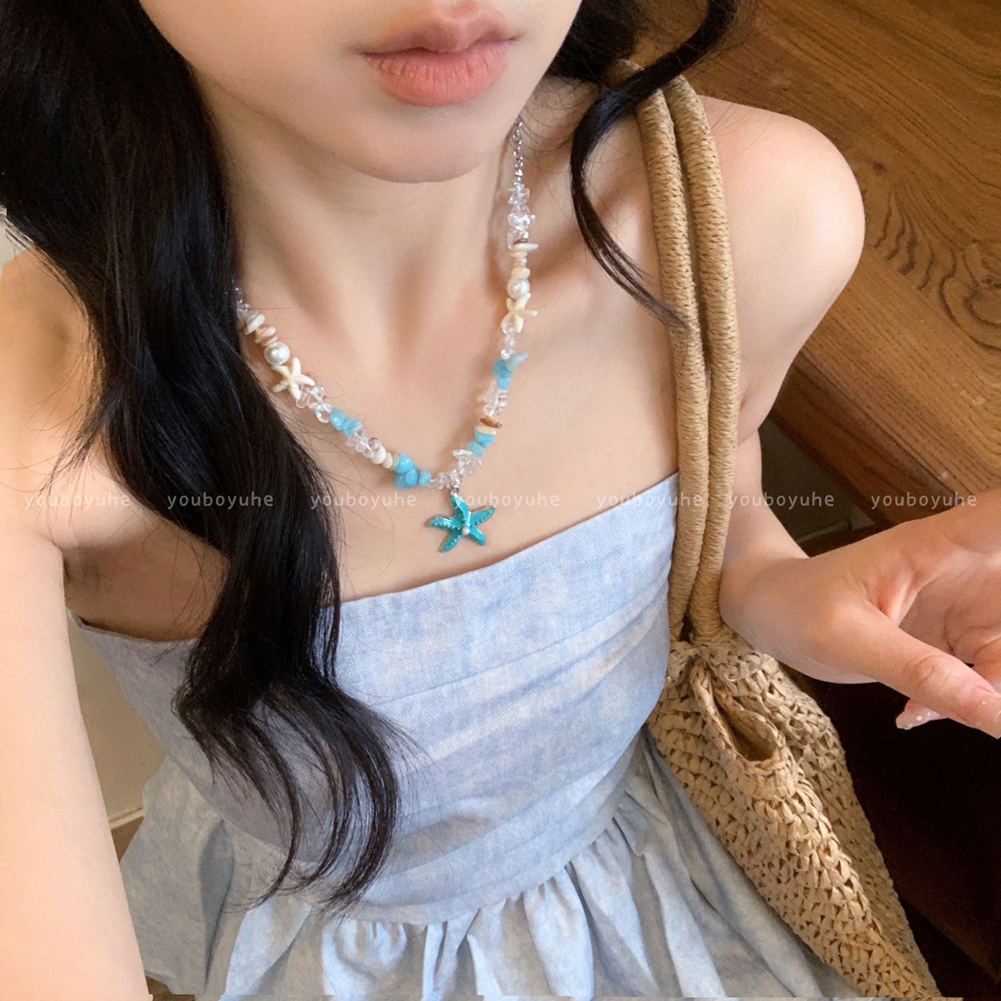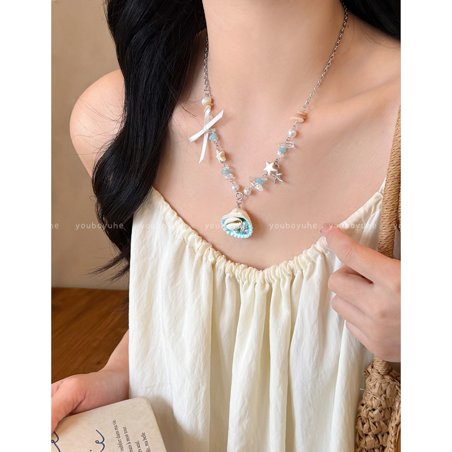 海边限定~ 蓝色蝴蝶结贝壳串珠项链女三亚度假锁骨链时尚小众配饰