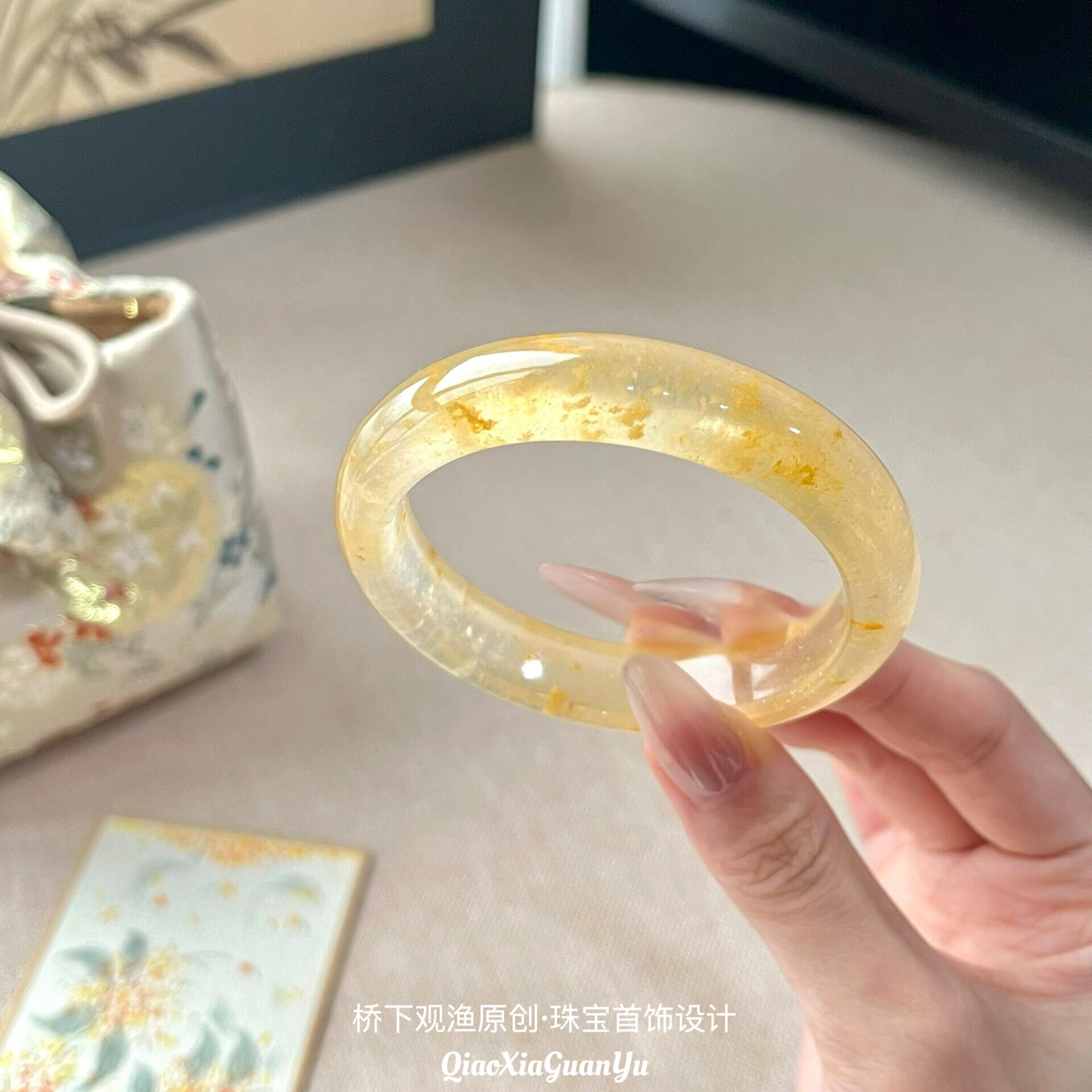 天然高冰黄飘花手镯女手镯桂花酿黄色玉手镯正圈送礼香槟金石英岩