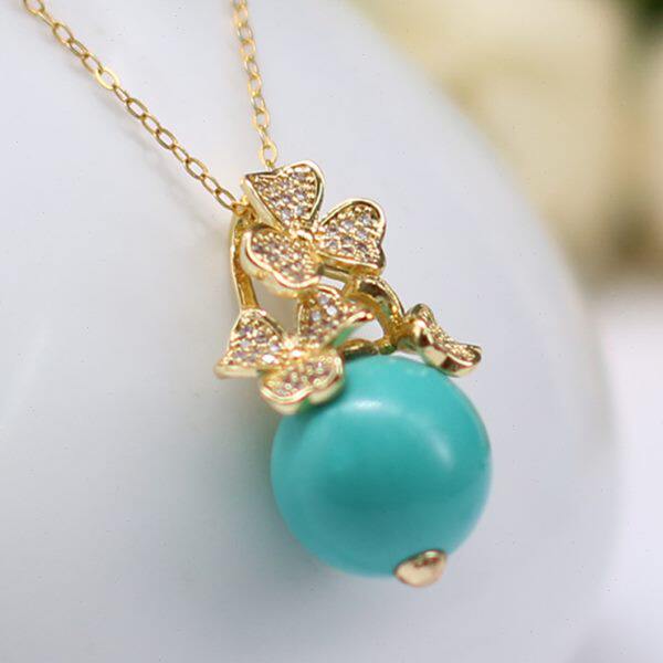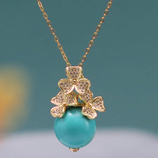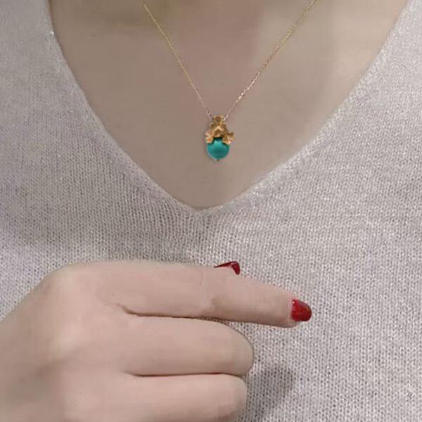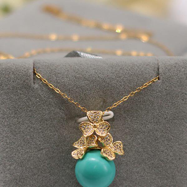 蓝色项坠吊坠女纯银小众设计镀绿松石锁骨链花朵金生日礼物镶嵌