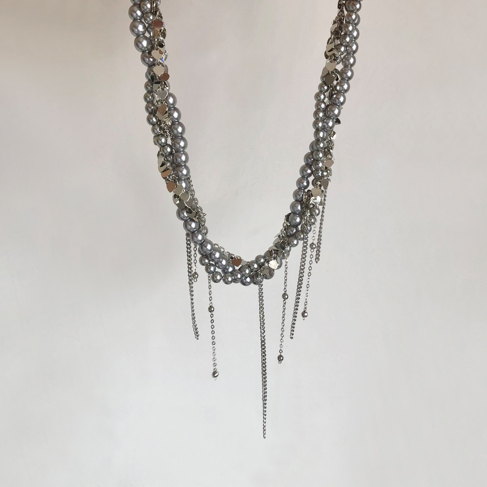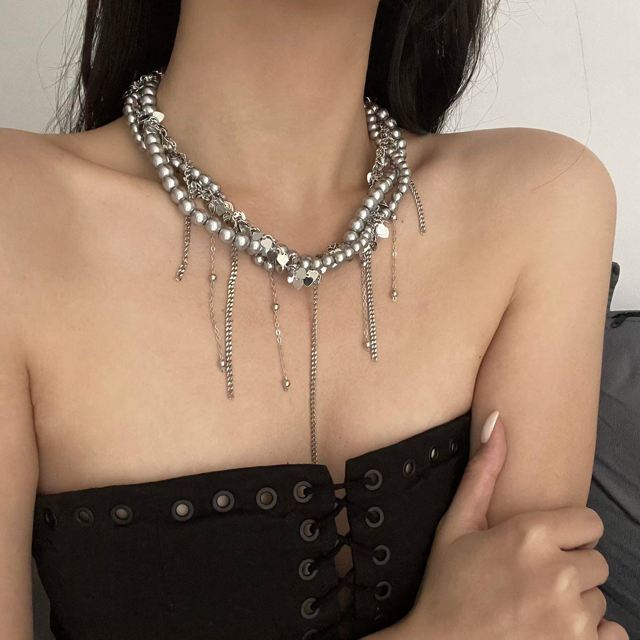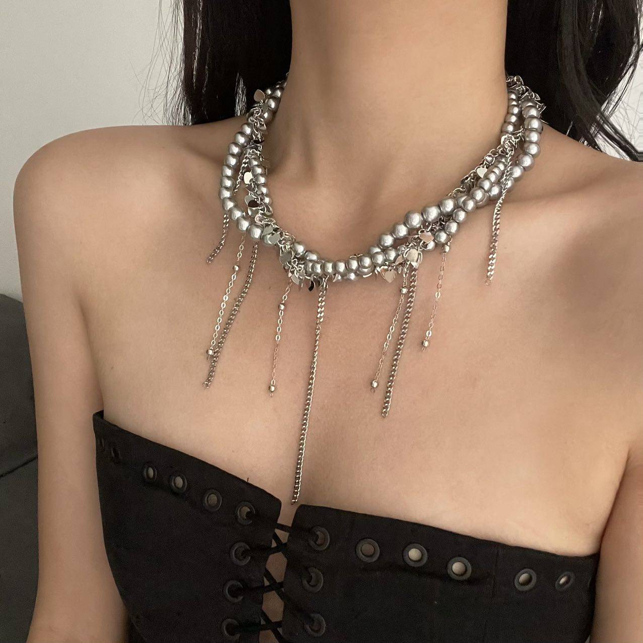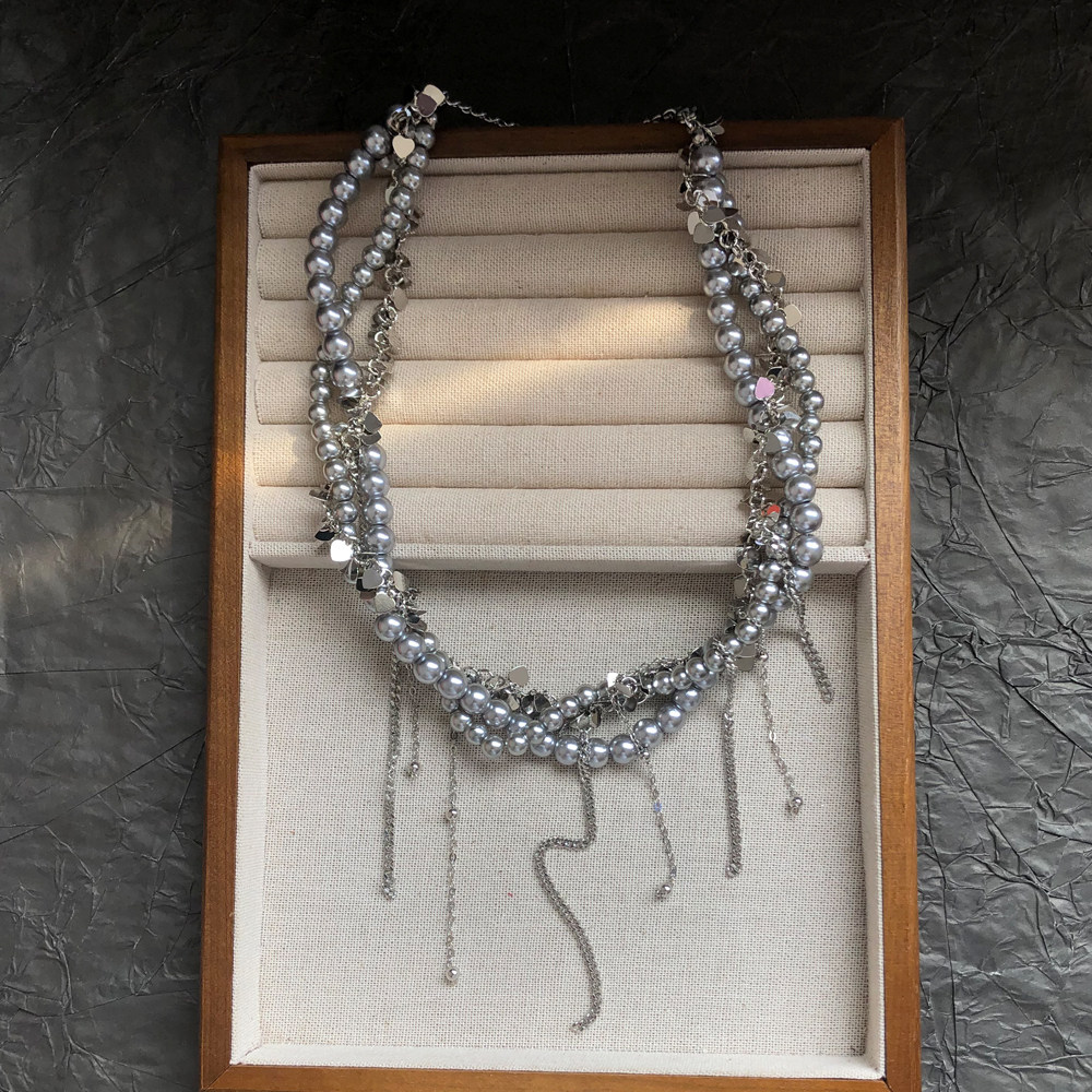 多层缠绕灰色珍珠亮片流苏项链女轻奢高级感甜酷时尚锁骨链颈链潮