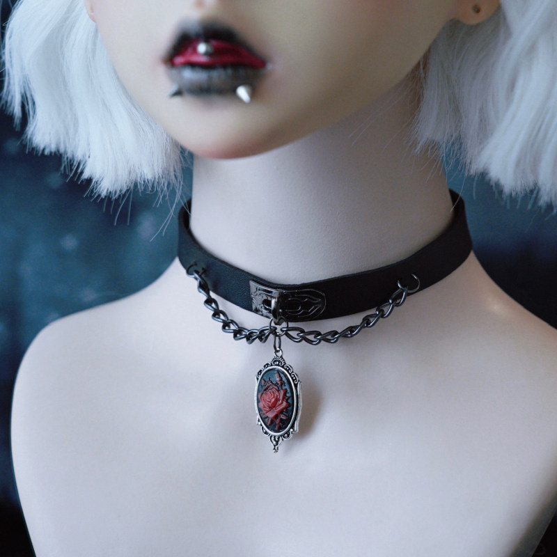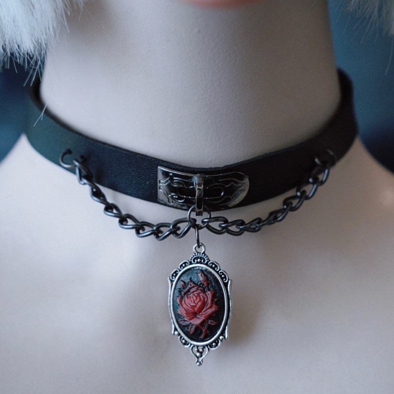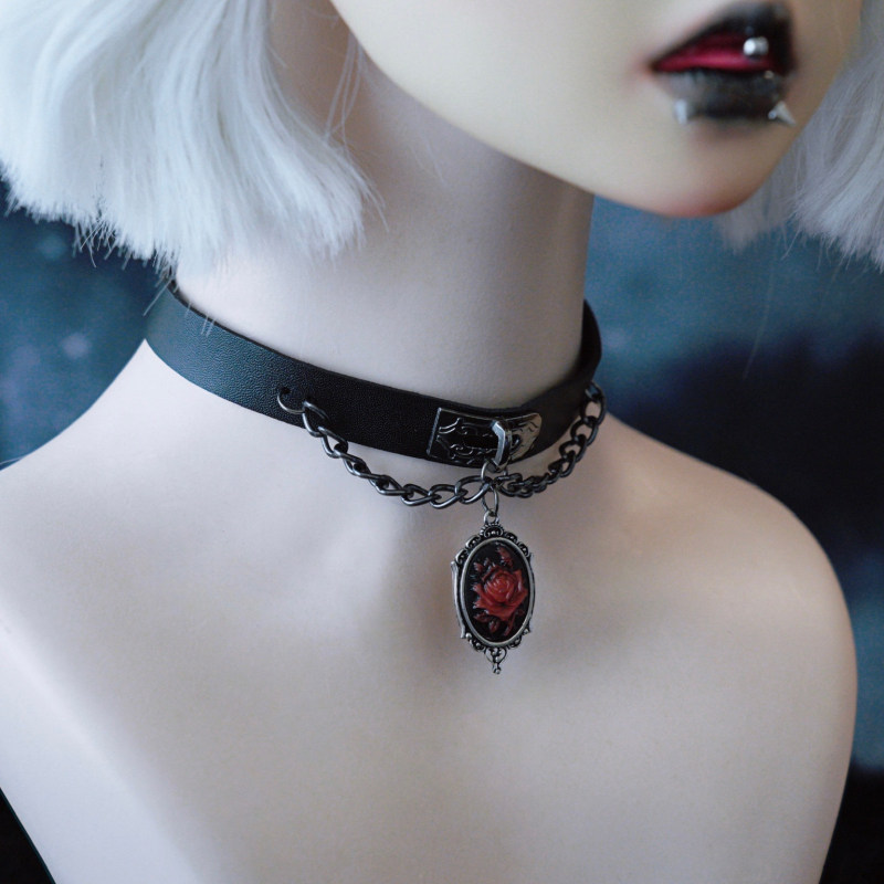 怪糖饰物集原创手工黑红玫瑰吊坠仿皮颈链choker暗黑亚文化黑红色