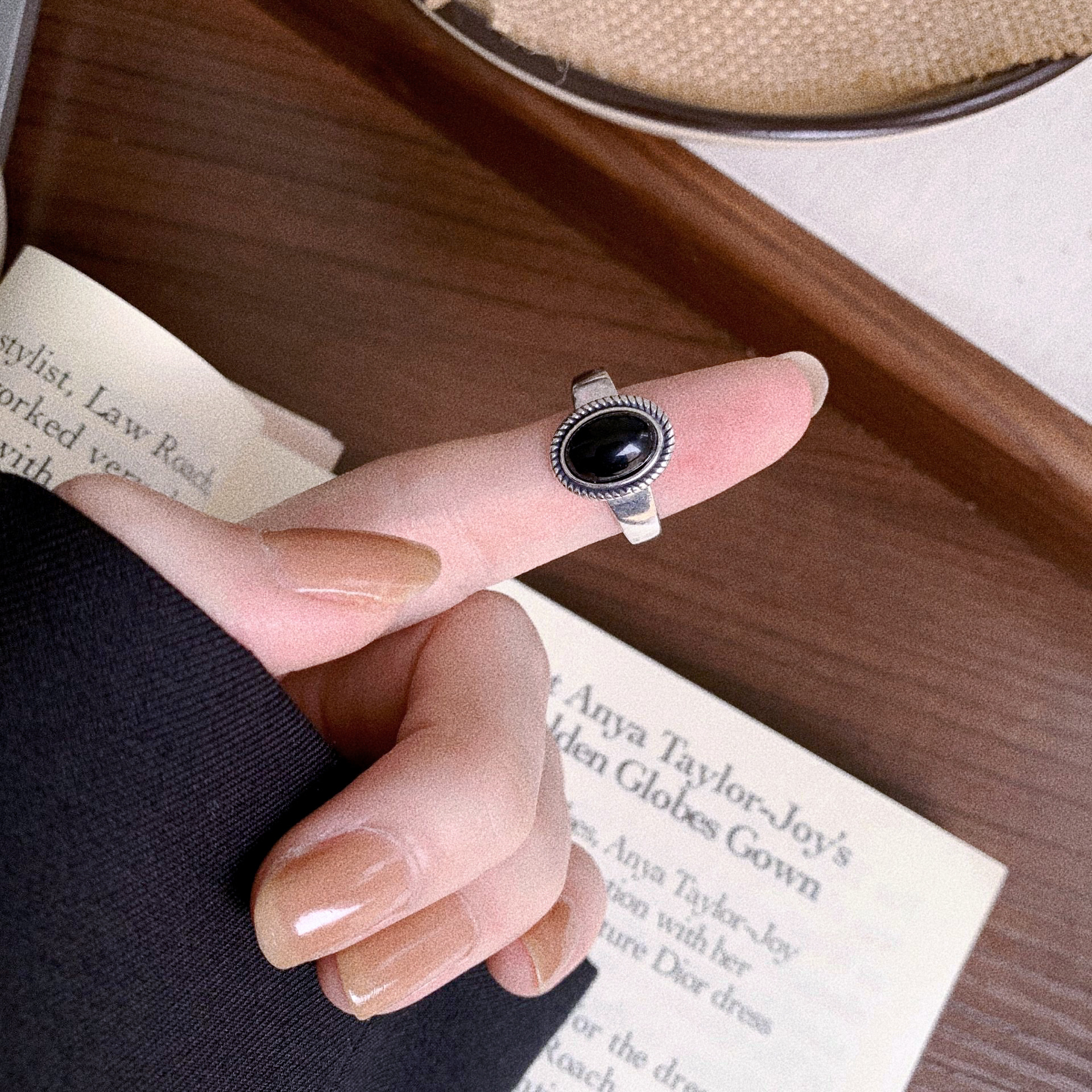黑玛瑙戒指纯银开口绳边轻奢个性复古手工小众设计高级感中古饰品