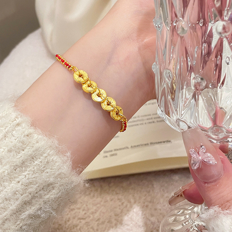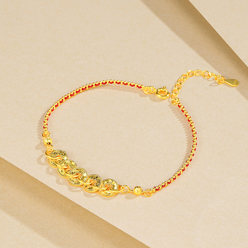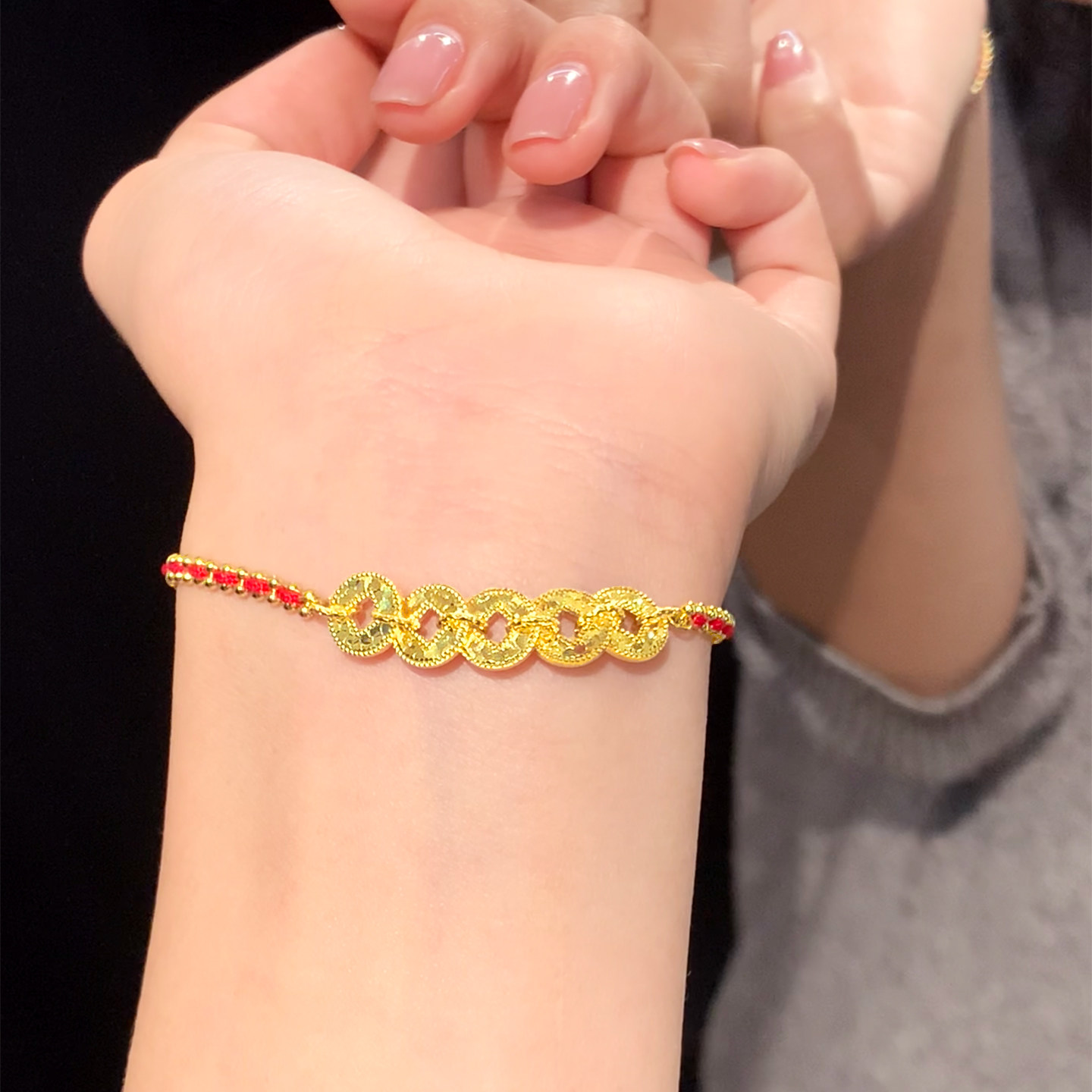 金店同款镀金超闪碎碎冰五帝钱红绳手链小巧复古编织手绳女款饰品