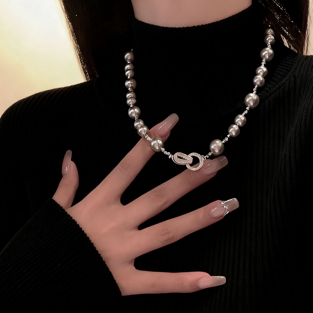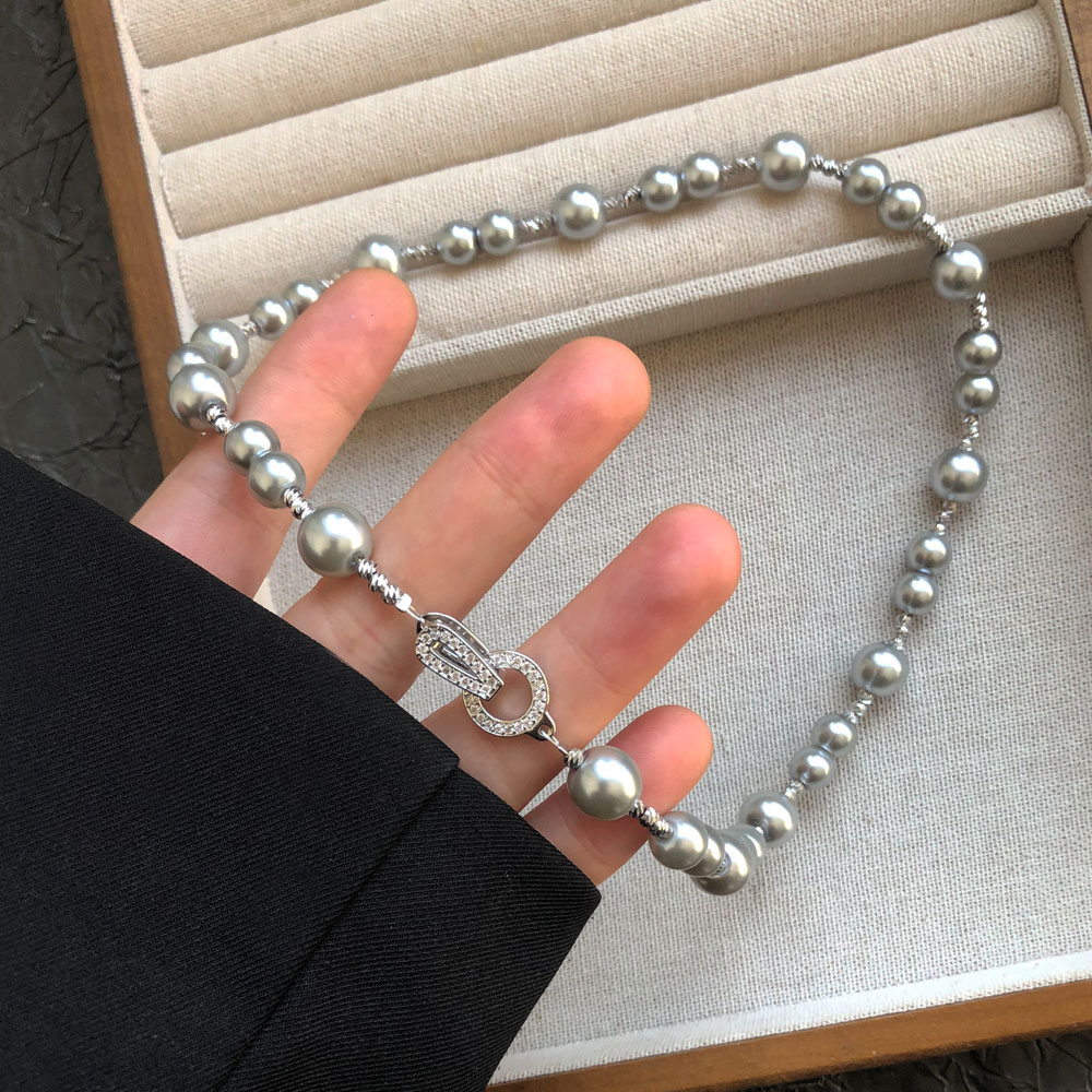 微镶锆石闪钻灰色珍珠项链女秋冬大小串珠锁骨链高级感毛衣链配饰