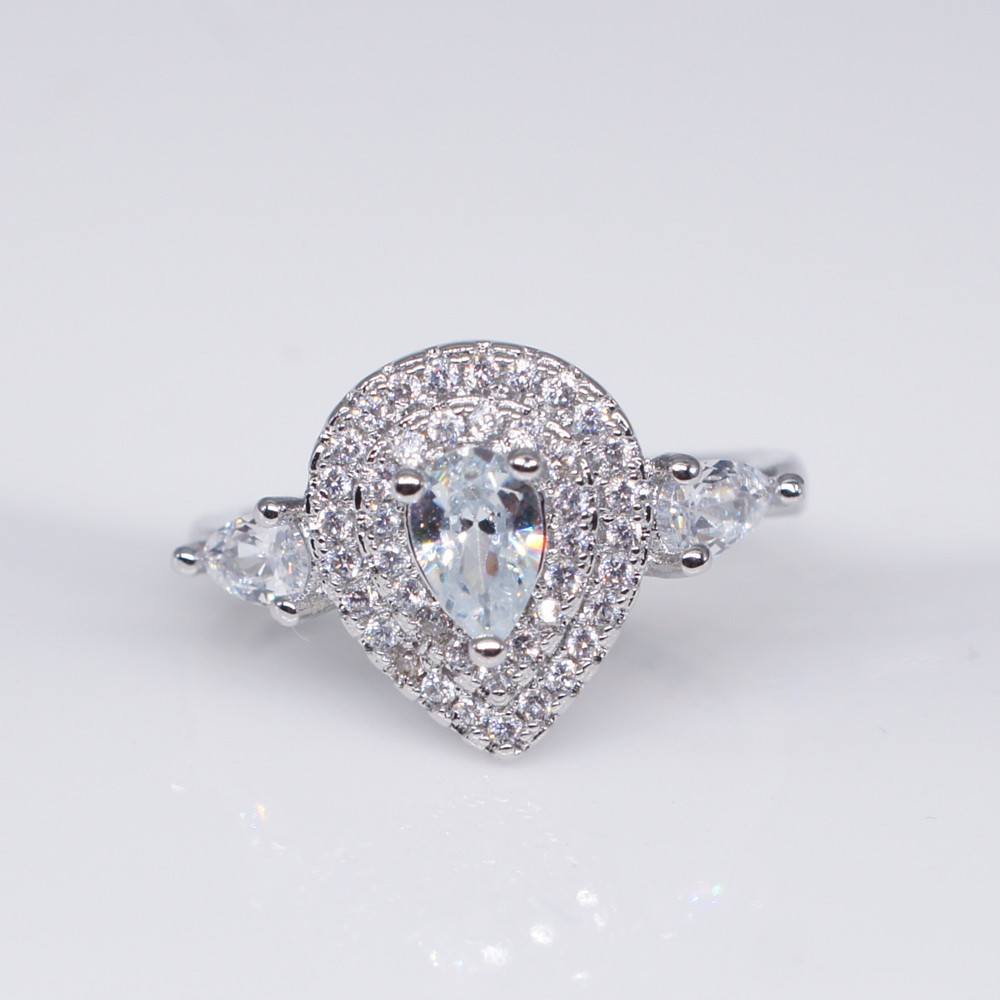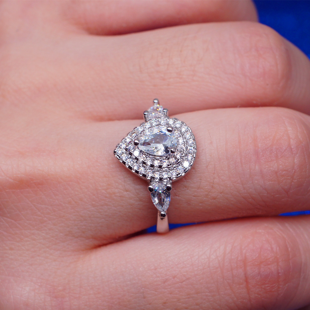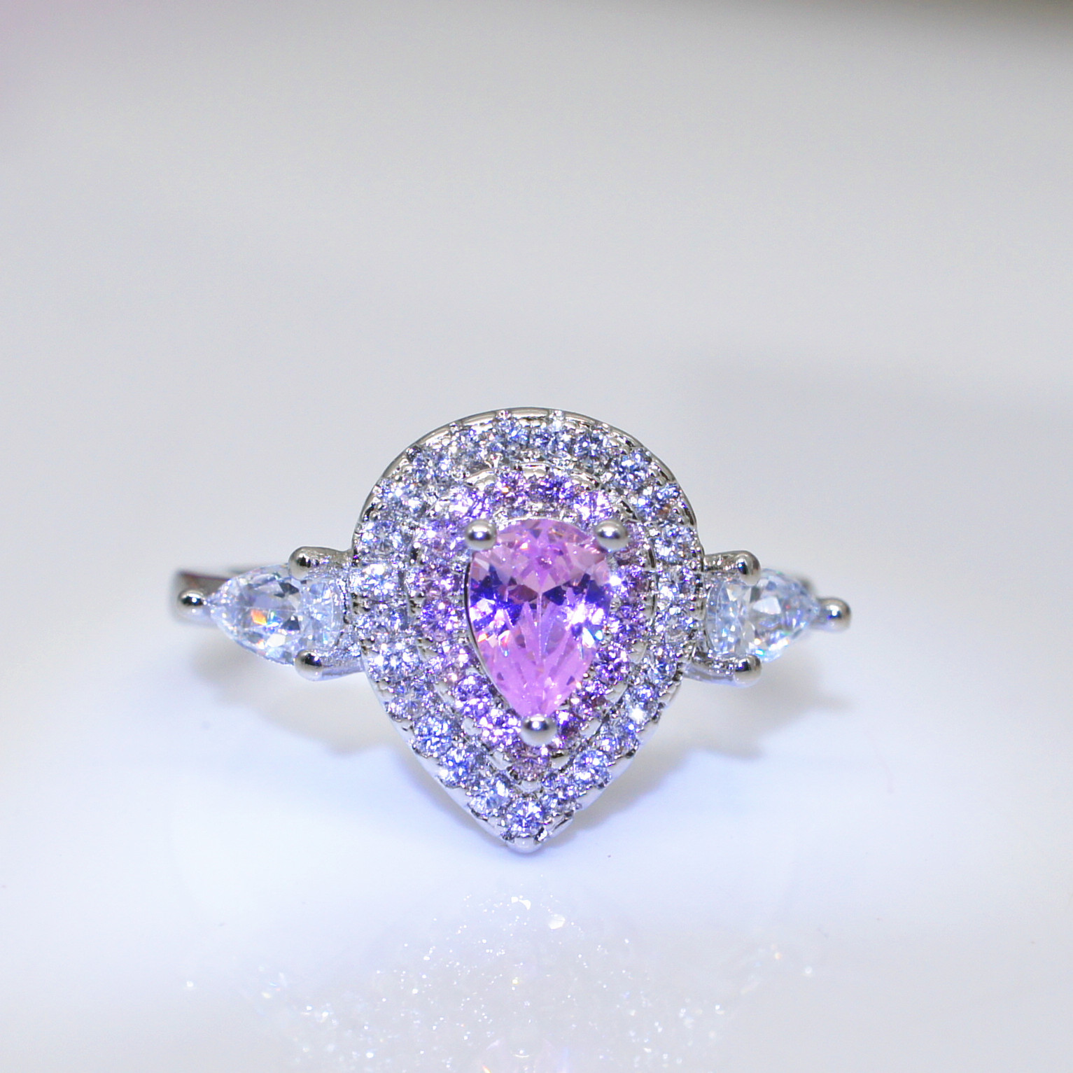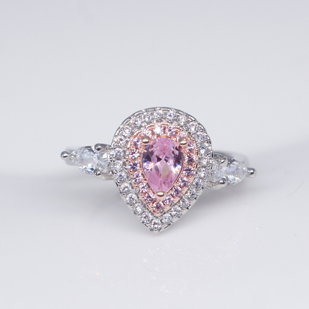 Youngwish热卖裸彩粉钻石女款订婚戒指水滴形微镶满钻仿真钻戒