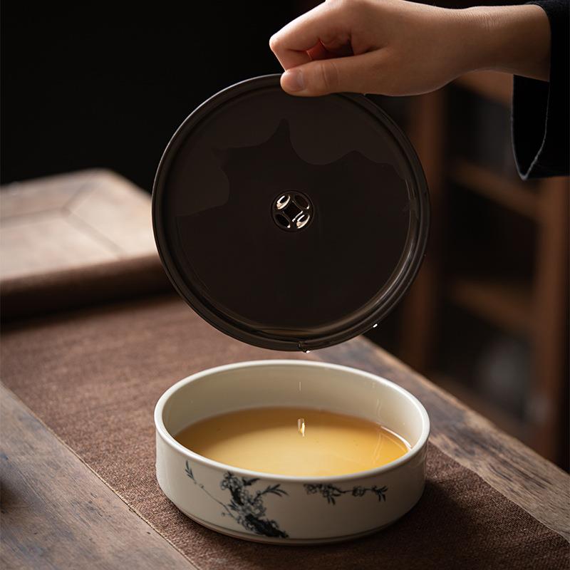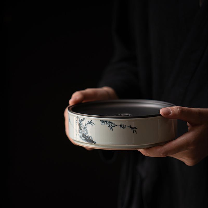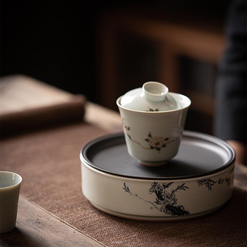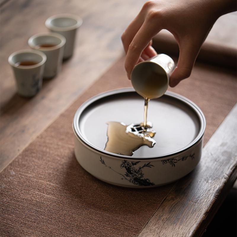 墨己古青锡盖壶承陶瓷蓄水圆形干泡盘茶道配件青花小茶盘