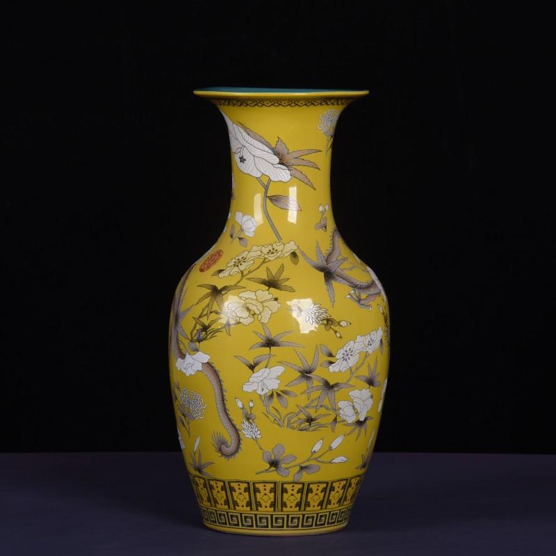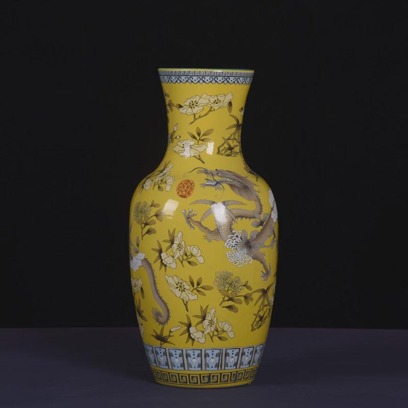 大雅斋粉彩黄色龙纹花瓶摆件桌面装饰品特色插花器皿日式花道花器