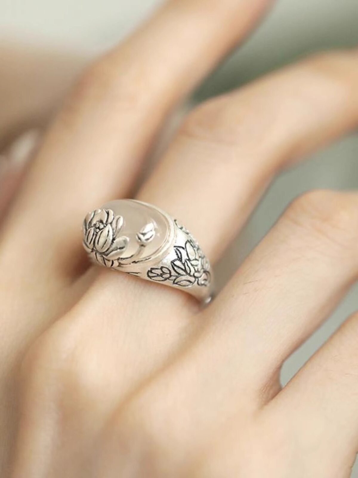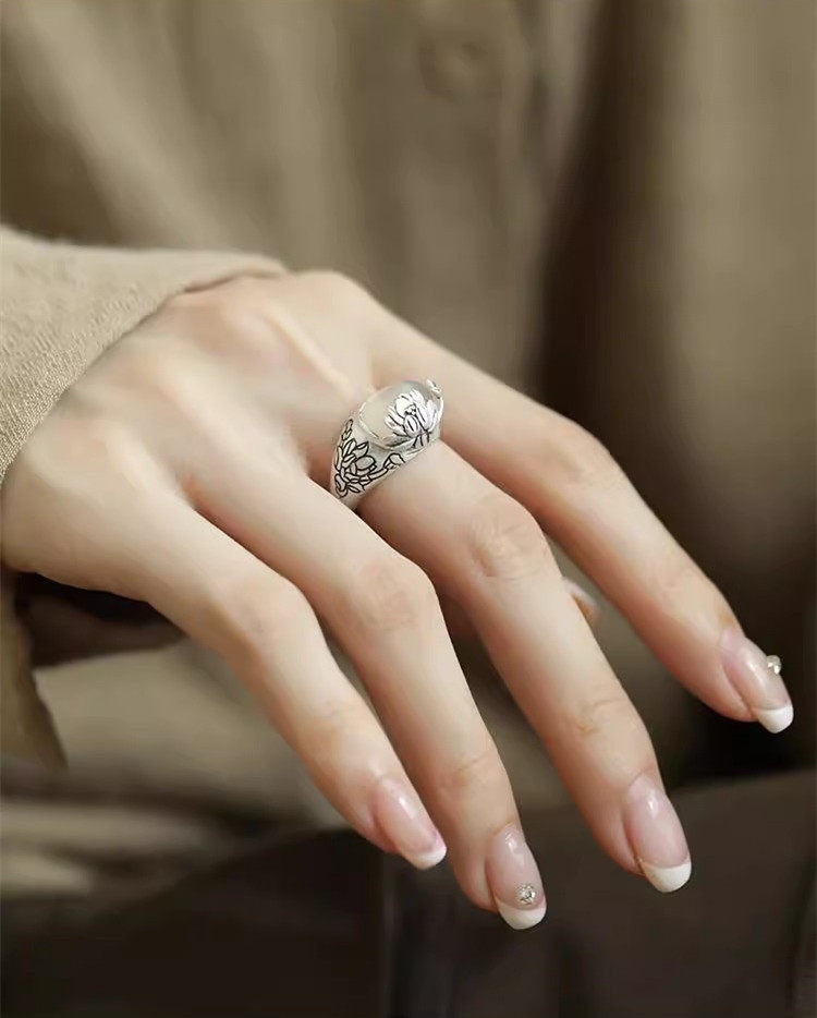 好运莲莲民族风925银白玉髓戒指女国风新中式莲花复古轻奢食指戒