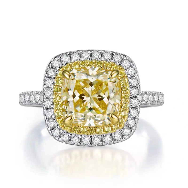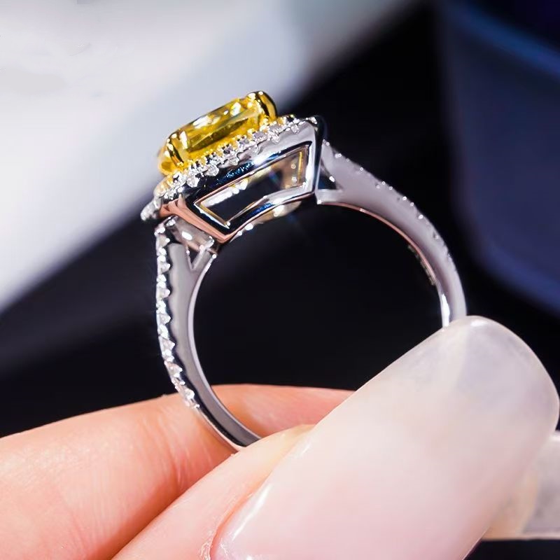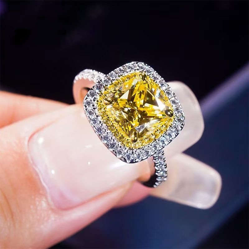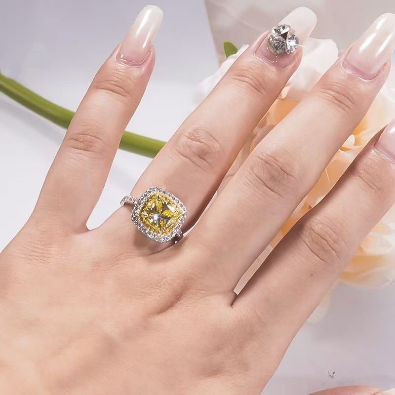 PT950铂金时尚莫桑石四爪公主方黄钻戒指奢华爆闪2.5克拉新款纯银