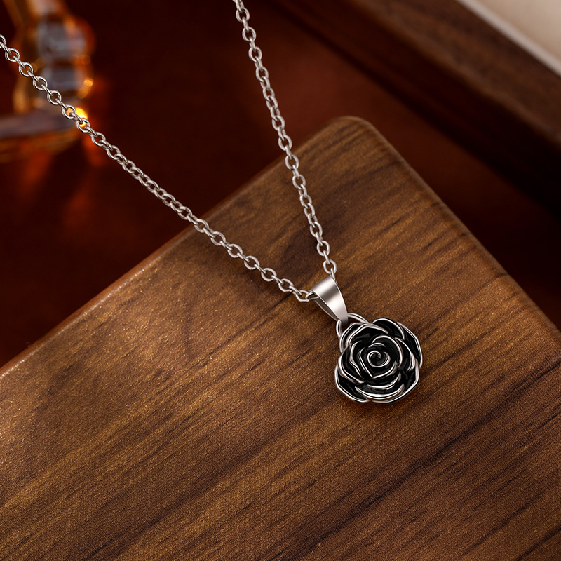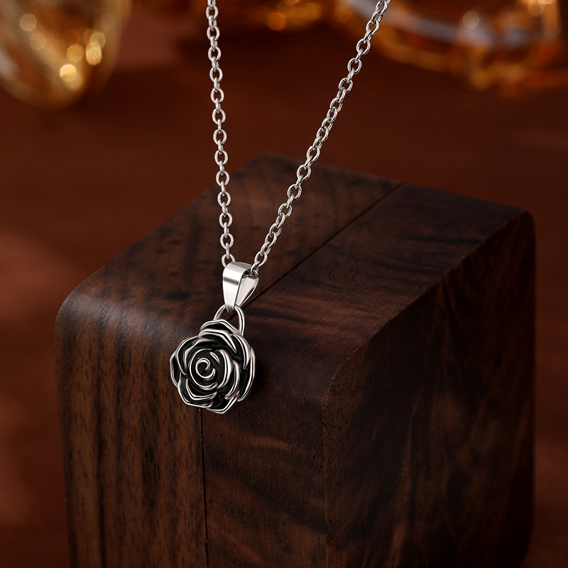 法国cherrykokos925银黑色玫瑰花吊坠项链欧美复古简约花朵锁骨