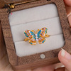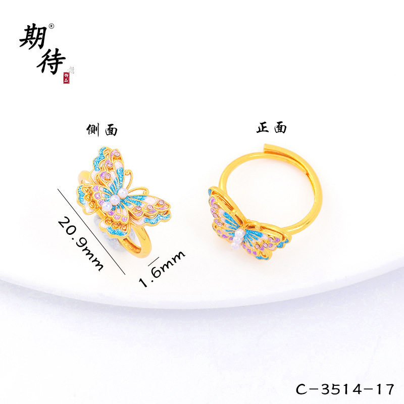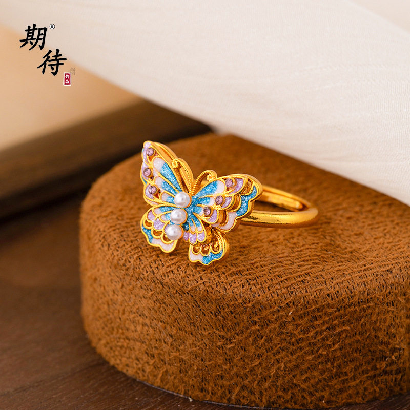 不掉色古法沙金珐琅彩蓝色渐变珍珠蝴蝶戒指在逃公主花边戒指女