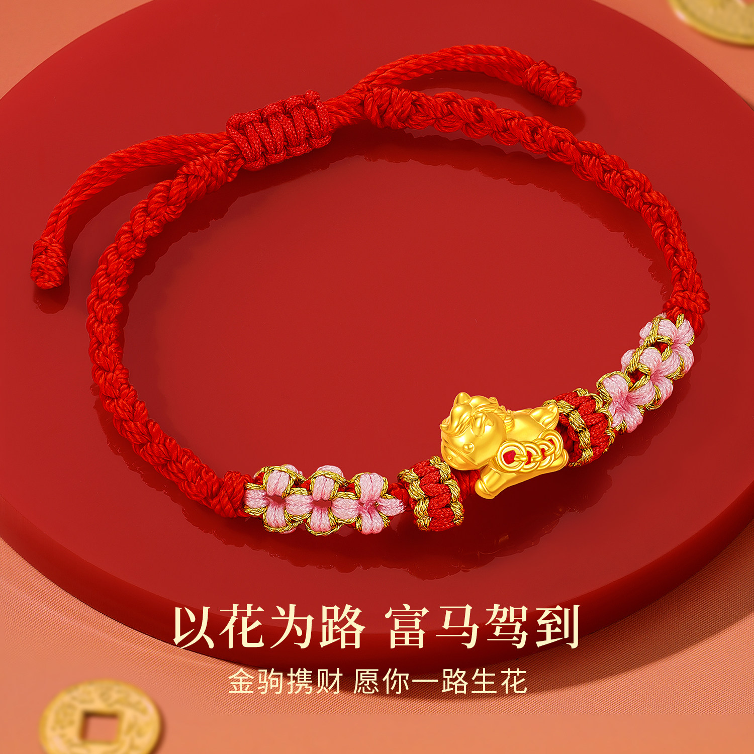 中国黄金央创马年本命年手链女款新款马上有钱足金红绳生肖礼物