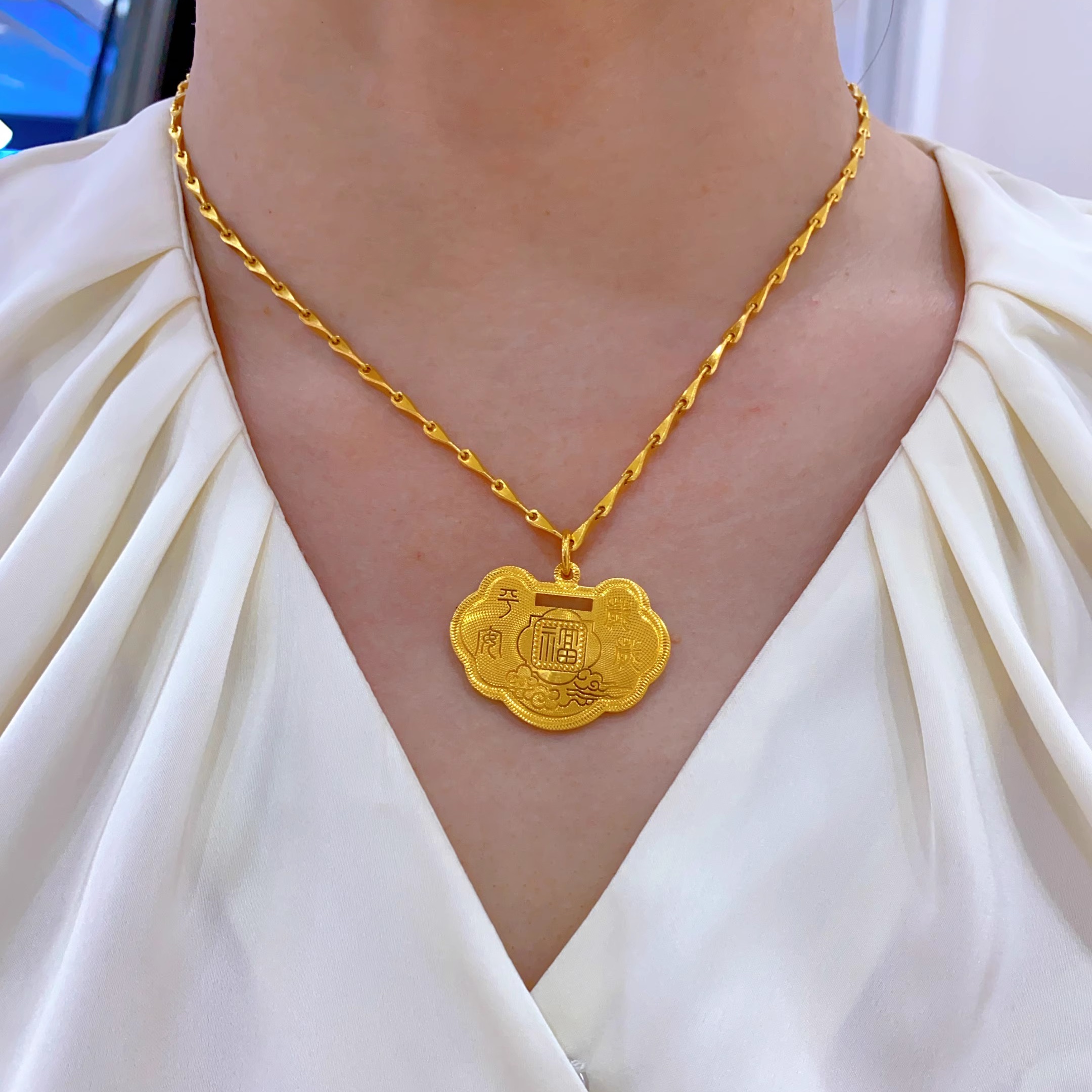 金包银吊坠长命锁儿童平安锁实心车花亮面吊坠宝宝金项链满月锁包
