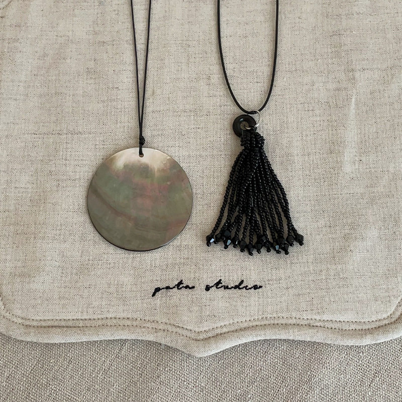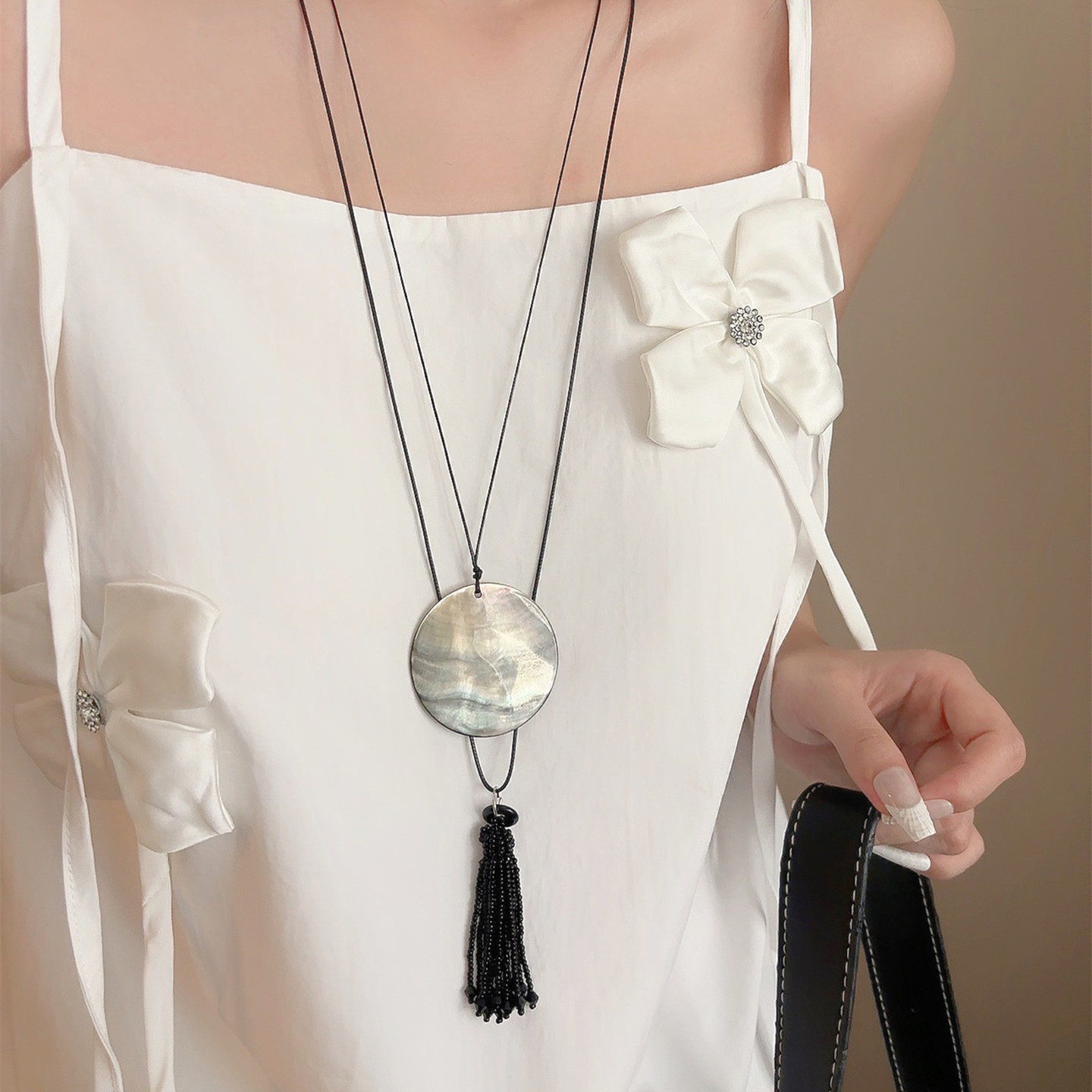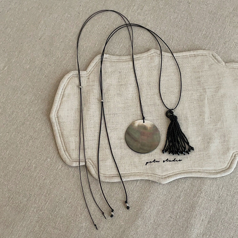 极简风天然黑蝶贝壳圆片项链女韩系黑色流苏串珠叠戴长款毛衣链
