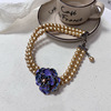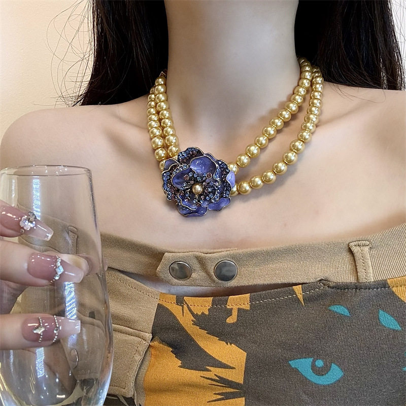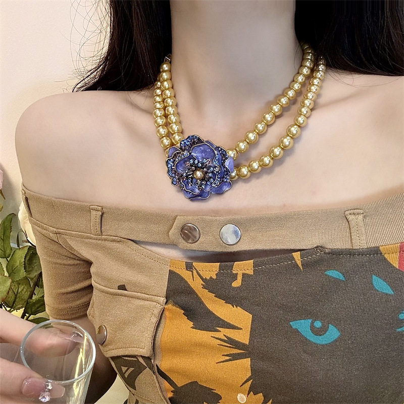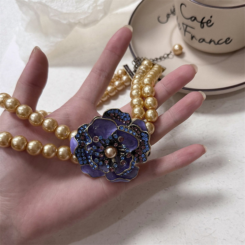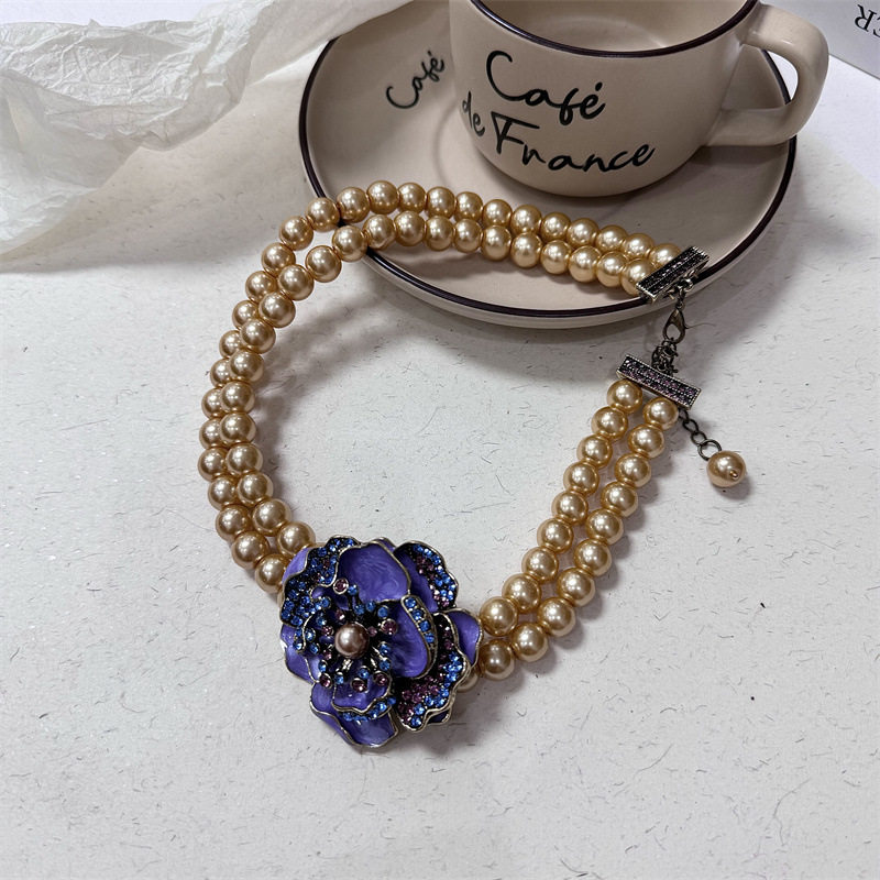 双层仿珍珠镶钻花朵项链法式复古串珠锁骨链小众气质颈链颈饰