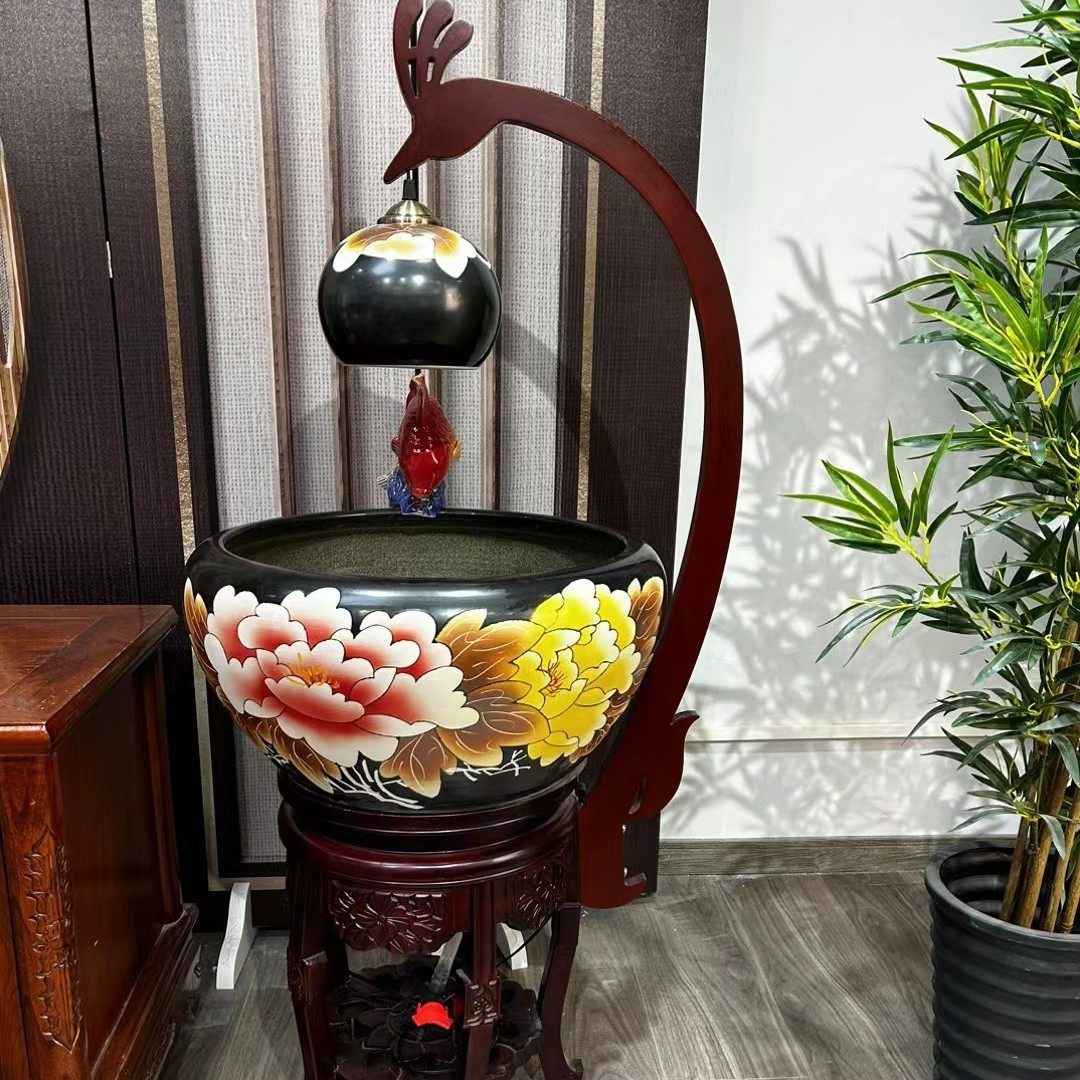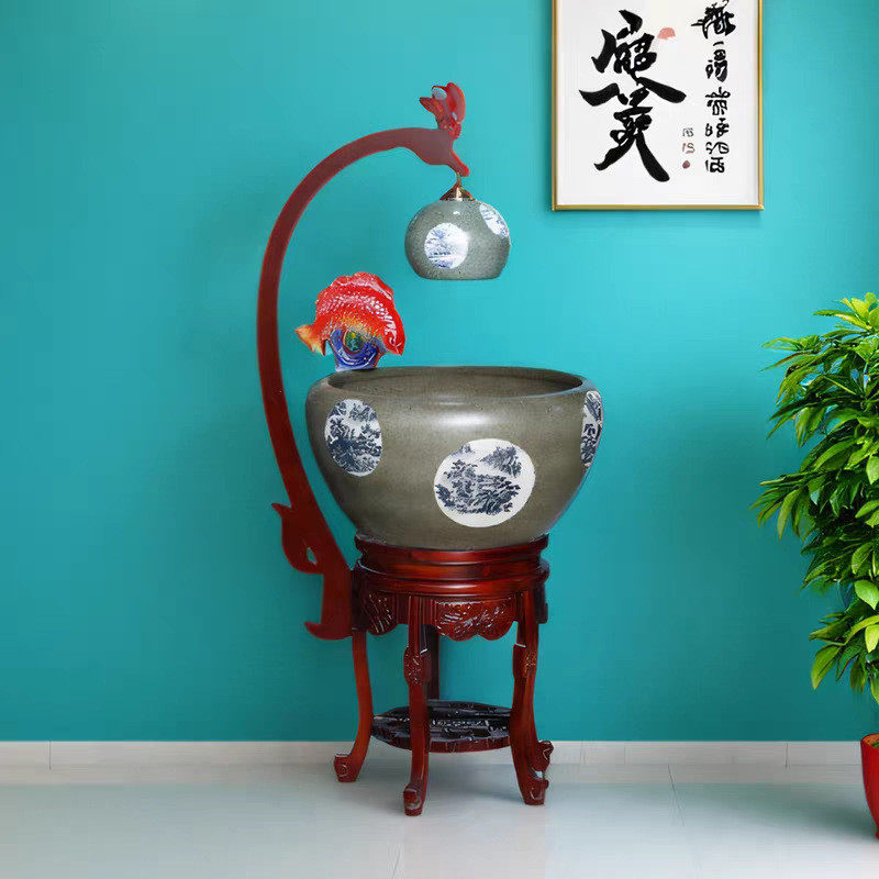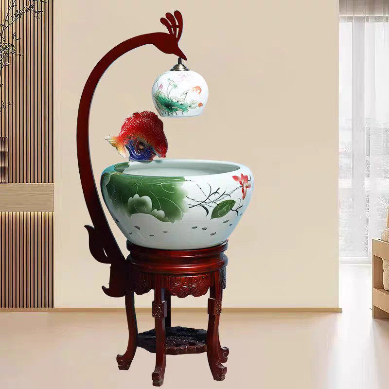 景德镇陶瓷鱼缸新中式循环增鱼流水加湿氧盆落地鱼缸玄关装饰摆件