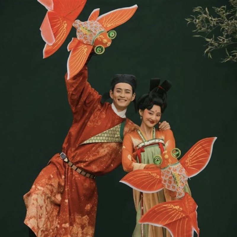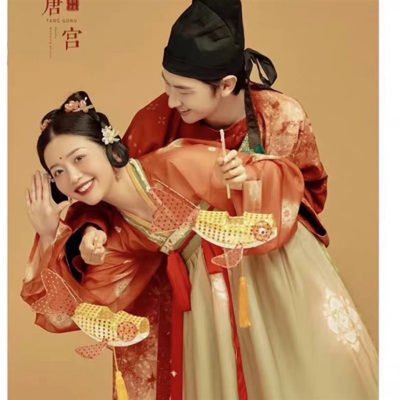 新唐宫夜宴主题唐装古风俏皮中式婚纱汉服拍照摄影手提鱼灯笼道具