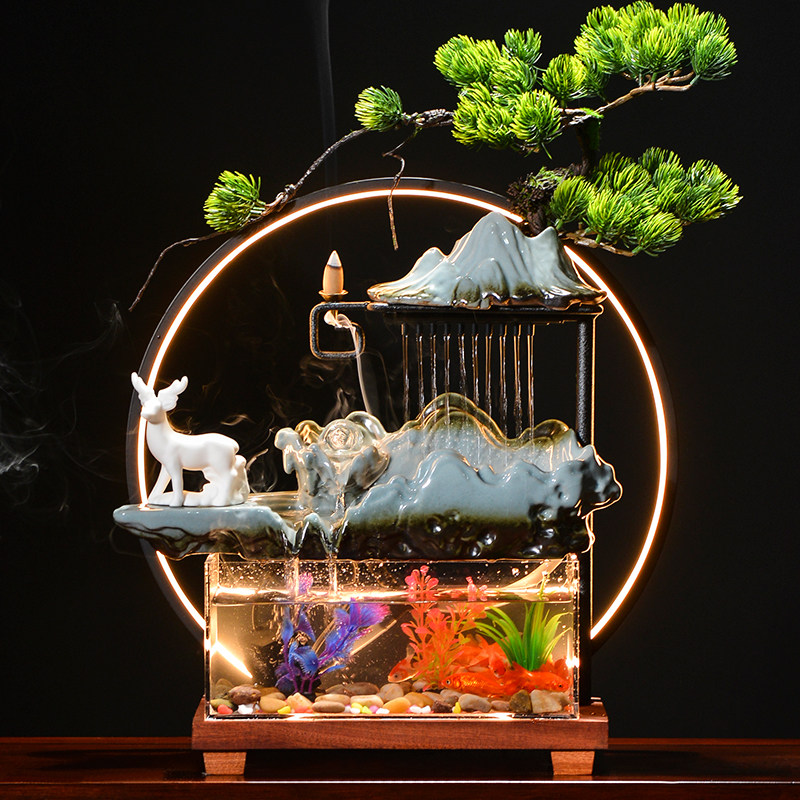 创意循环流水小型鱼缸招财摆件中式家居客厅装饰景观乔迁开业礼品