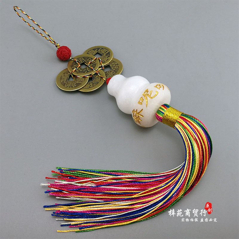 五帝钱白玉葫芦卸 纯铜五帝钱挂件 六字白玉葫芦家居真言挂饰