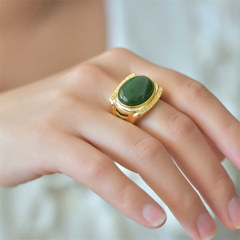 新疆天然和田玉碧玉豪镶款戒指男女款镶嵌玉石扳指可调节戒圈