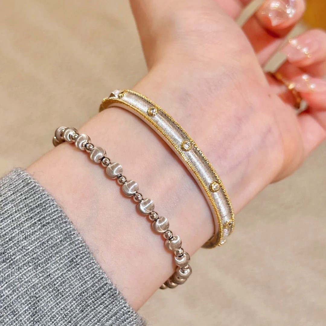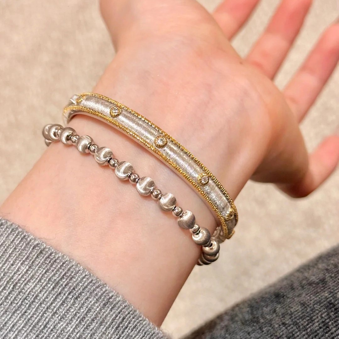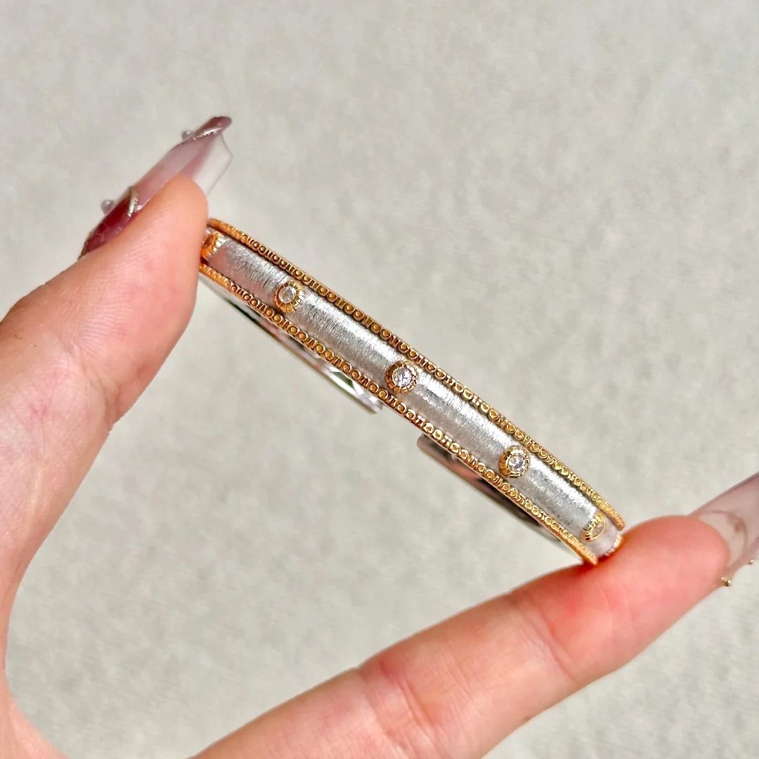 Young布契拉丝工艺织纹雕金手镯女镶钻双色金戒指窄版开口手环女