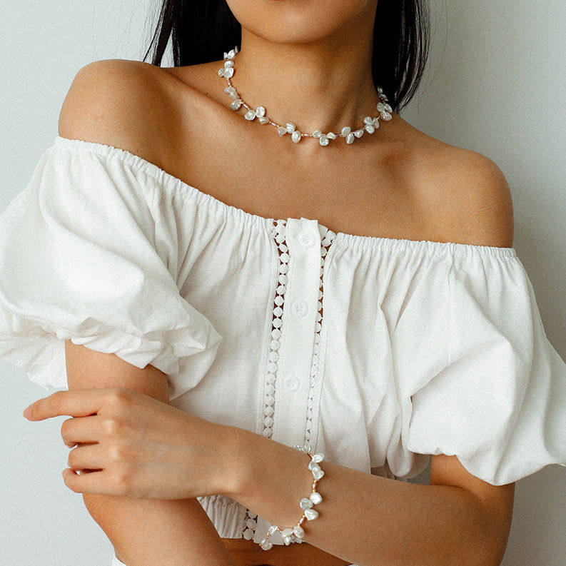 TU家法式气质天然花瓣珍珠项链手链轻奢高级感粉紫米珠锁骨链套装