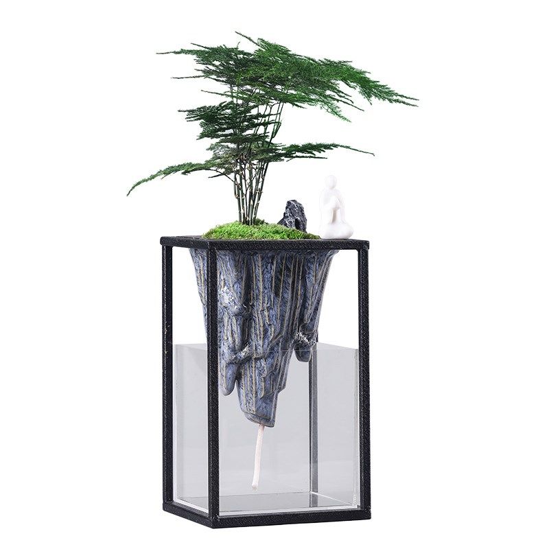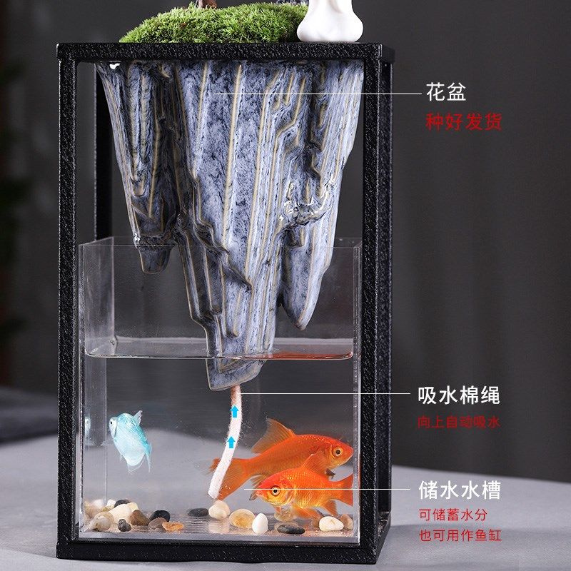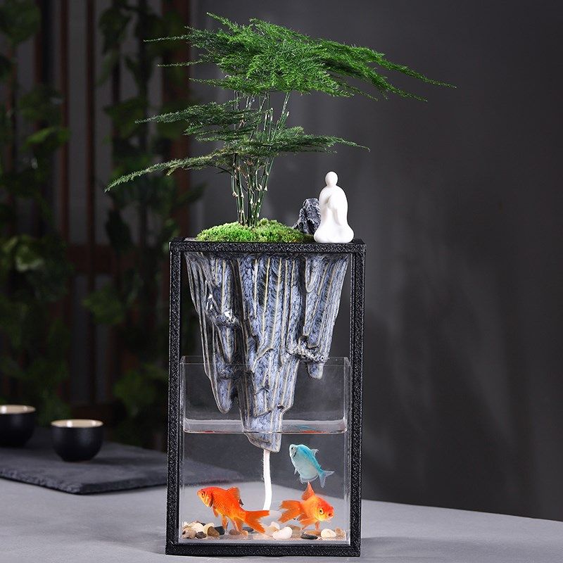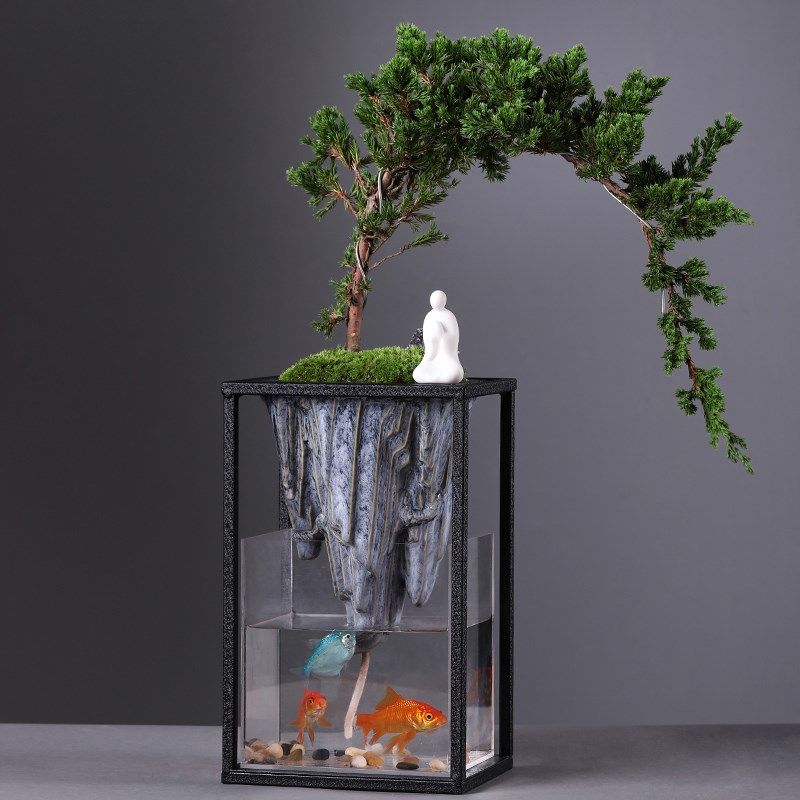 迎客松盆景室内鱼缸盆栽山水倒影客厅摆件玄关茶室书房绿植造景