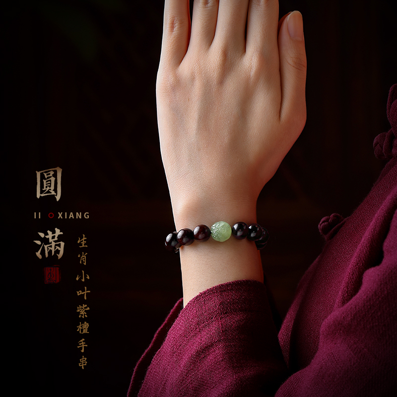 小叶紫檀手串男士六合生肖三合和田玉文玩佛珠檀木质转运手链真品
