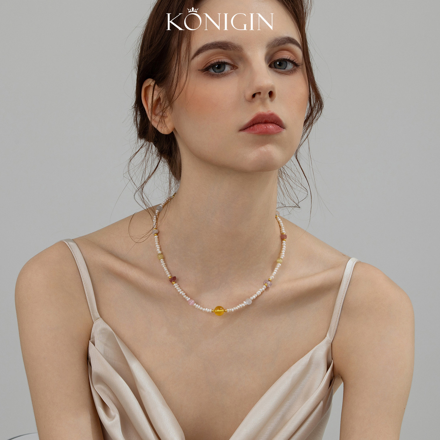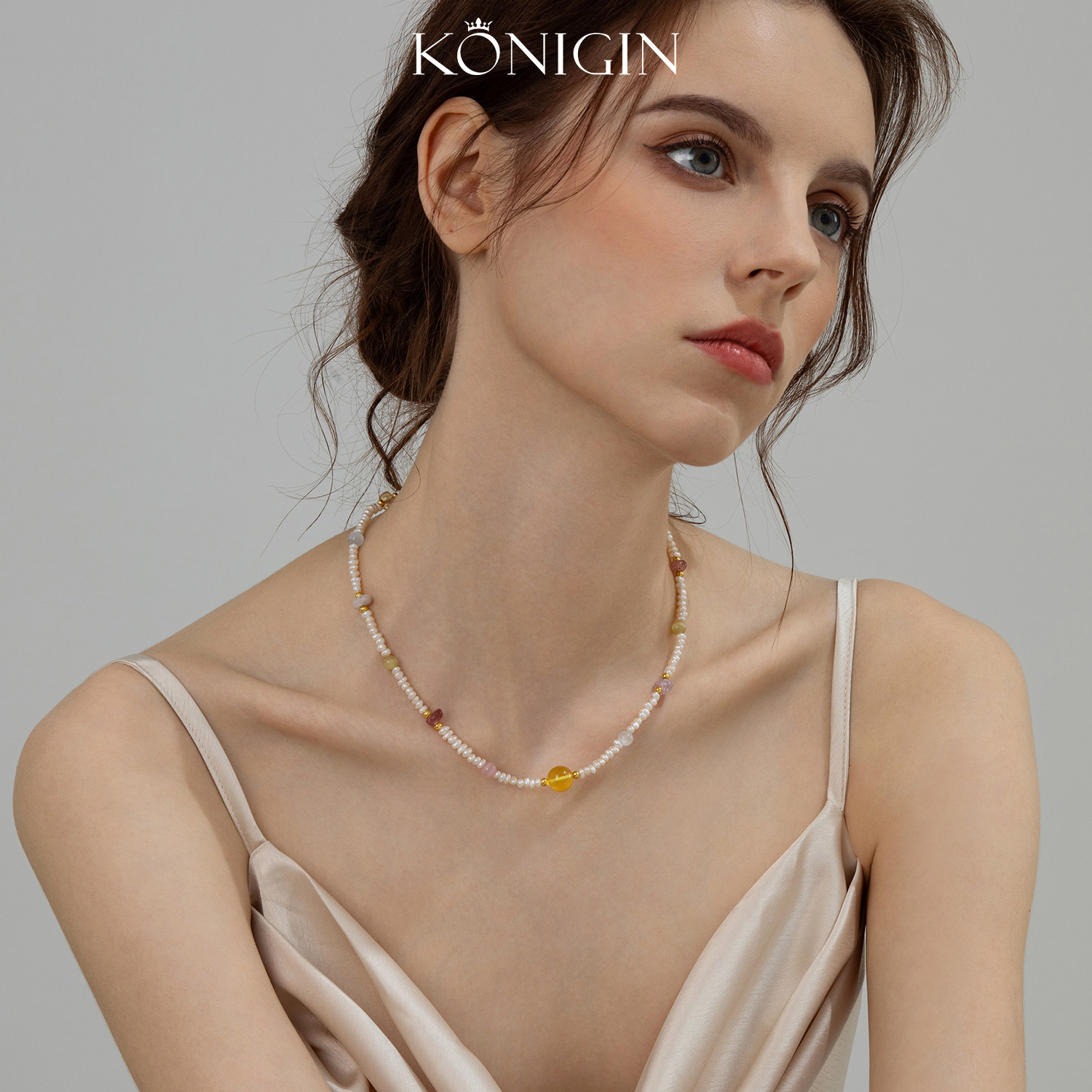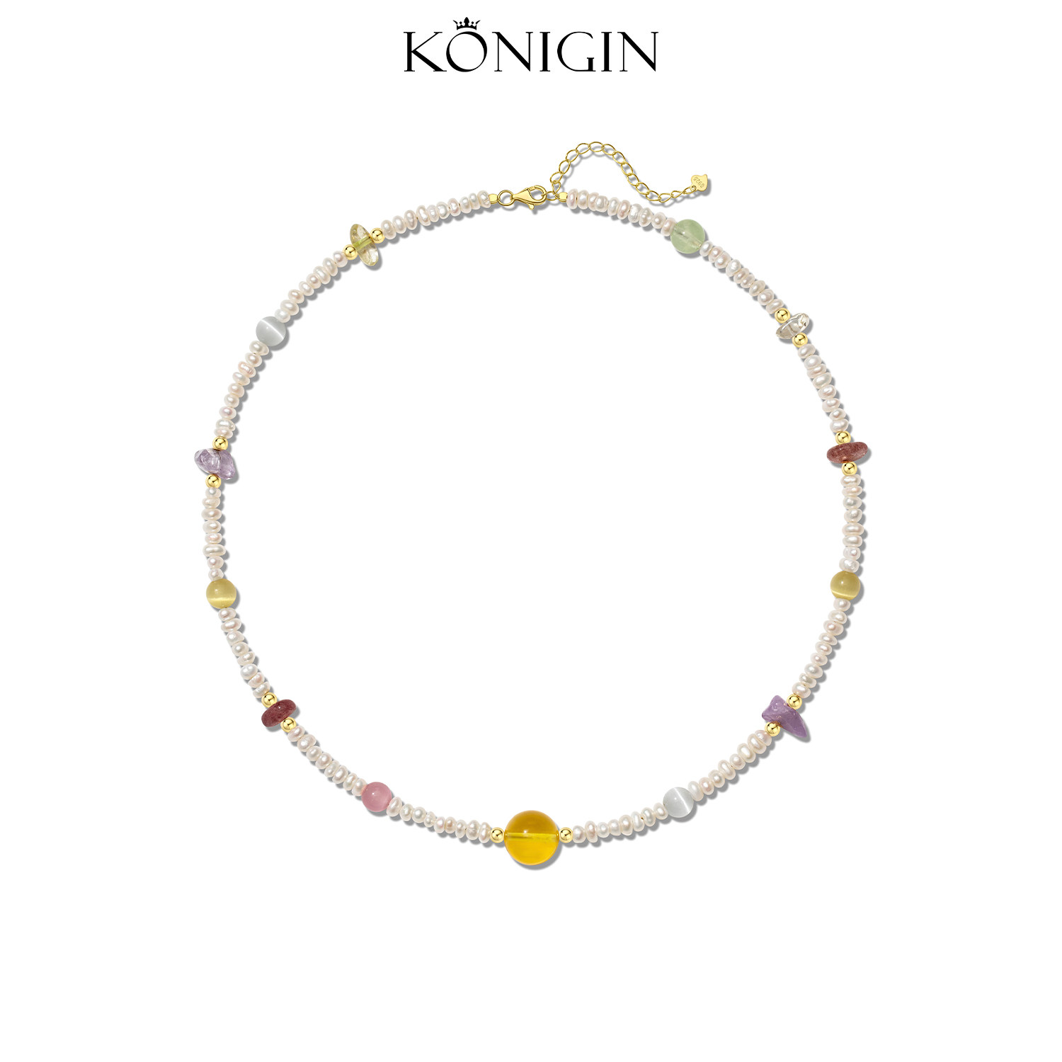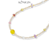 Konigin天然淡水珍珠项链女彩色天然石串珠锁骨链925纯银金珀颈链