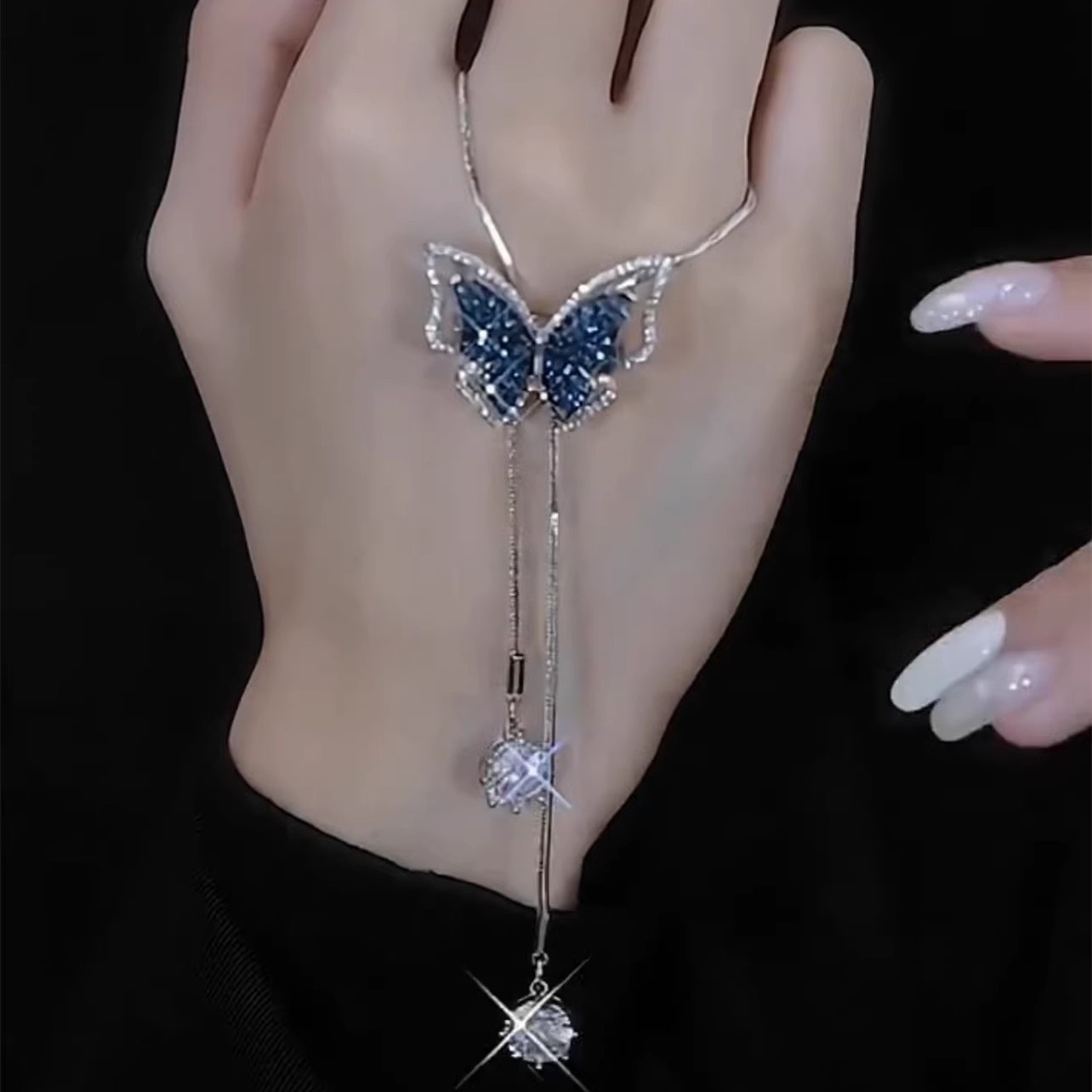 高级感镶钻蓝色蝴蝶项链女秋冬新款潮高级感可抽拉长款流苏毛衣链