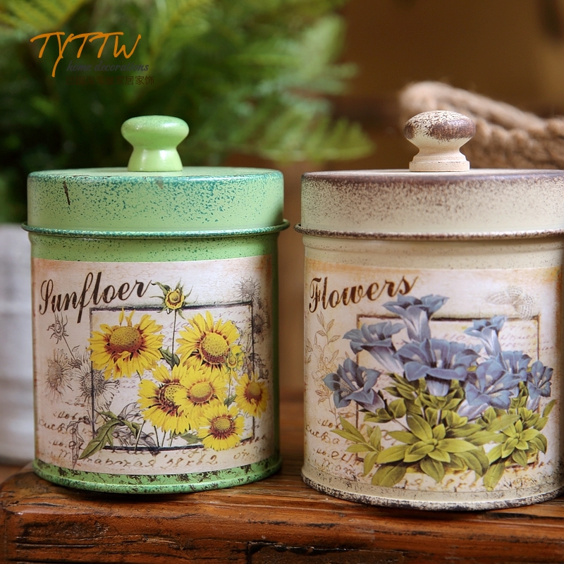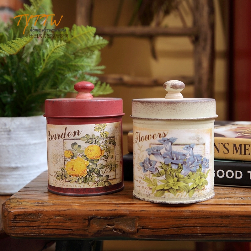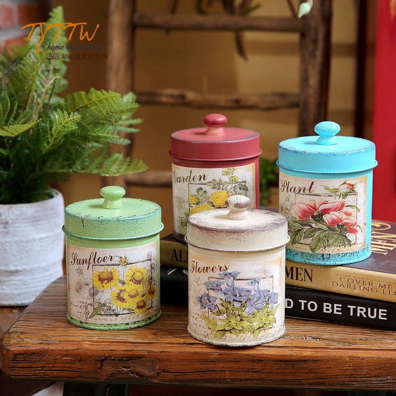 彩色复古油画风格铁艺铁皮桌面家居装饰收纳圆桶带盖收纳罐茶叶罐