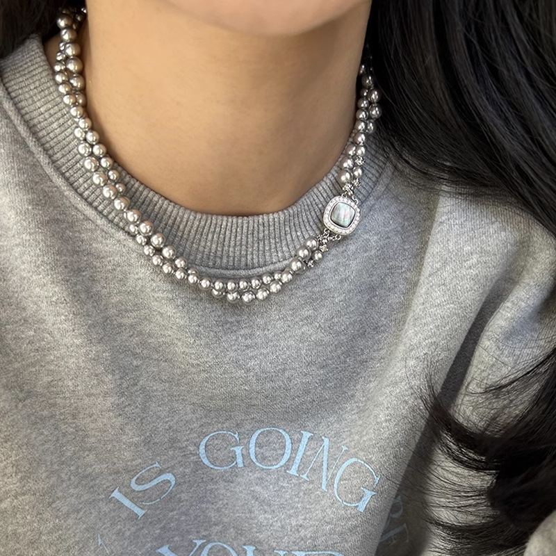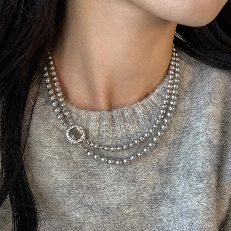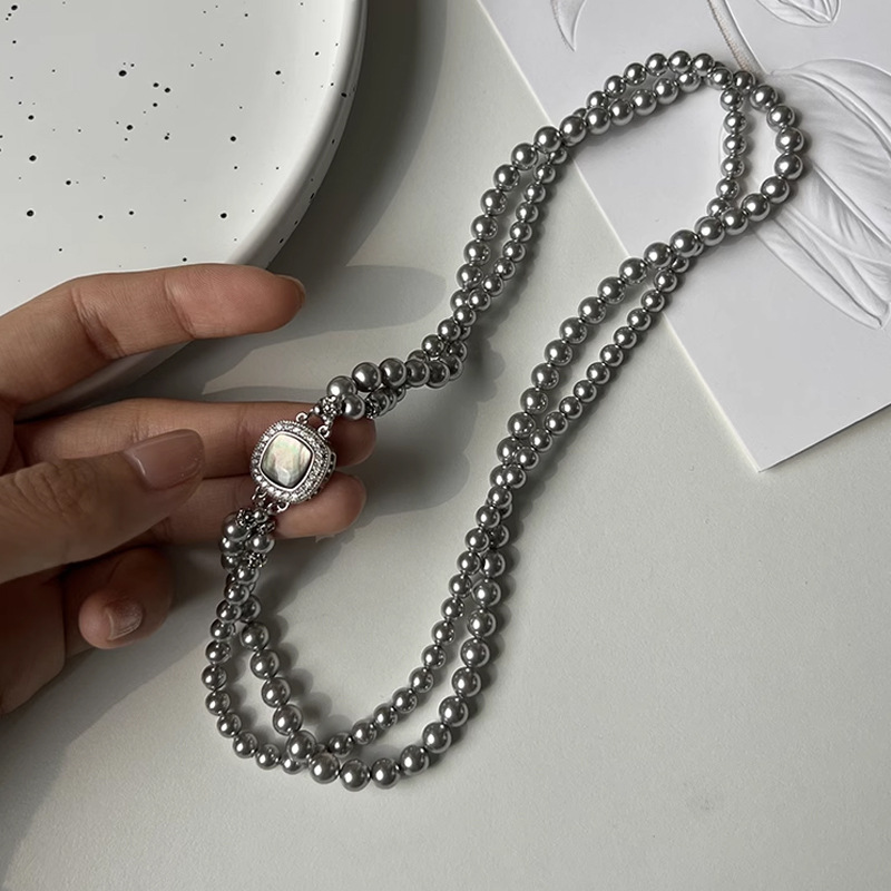 真多麻色灰贝母扣珍珠双层项链女秋冬百搭高级感小众女毛衣链
