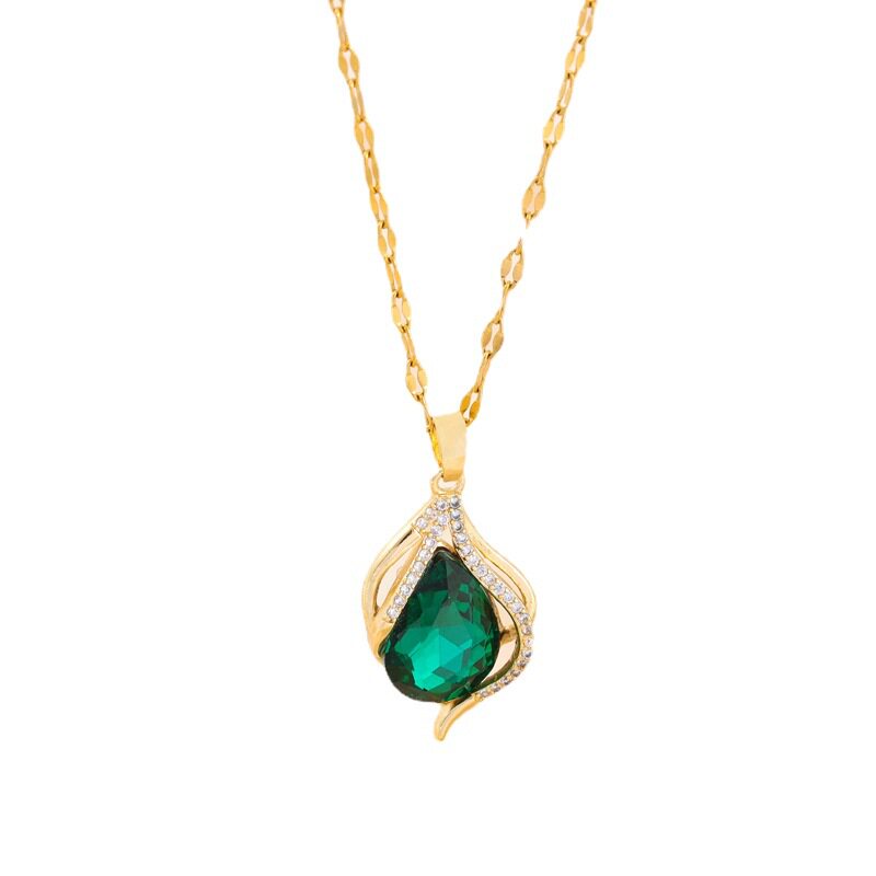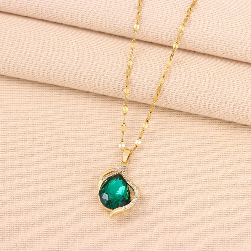 新款设计感轻奢复古绿色水晶吊坠钛钢项链女式不锈钢水滴锁骨链