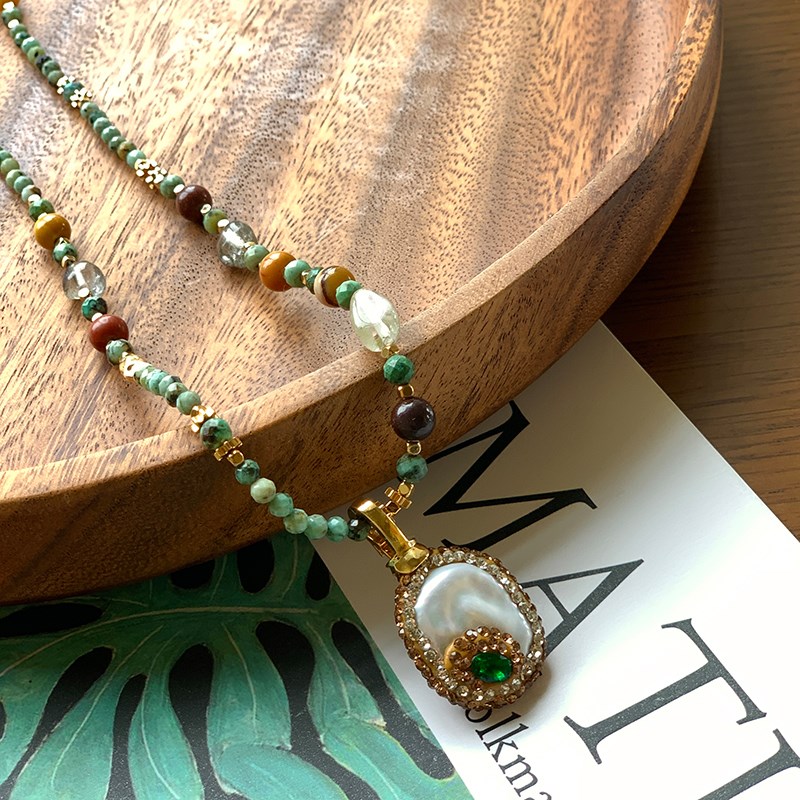 复古绿色系非洲松石淡水珍珠简约百搭气质串珠项链 安妮森林