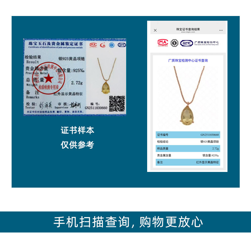 天然黄水晶银项链女轻奢简约水滴锁骨链吊坠刻字送证书生日礼物